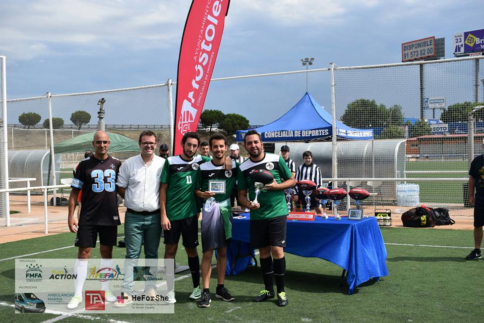 Antes de comenzar a contar lo estrictamente deportivo con el 7º puesto, agradecer al programa Flag Action y al club Móstoles Templars por la organización de este torneo espectacular que espera seguir muchos años y cobrar cada vez más relevancia en el Flag Football nacional. También el reconocimiento por su colaboración en árbitros y material a: la Federación Madrileña de Fútbol Americano (FMFA), la Federación Española de Fútbol Americano (FEFA) y su programa de promoción del Flag, TFA, Ambulancias Marina, y, por supuesto, a la colaboración de HeForShe, una campaña solidaria que promueve la igualdad de género, creada por ONU Mujeres. Ya sabéis, el Flag Football es un deporte mixto, y, como muestra de reconocimiento, a Phoenix, un equipo con categoría exclusiva femenina en este deporte, se llevó el premio HeForShe a la integración.