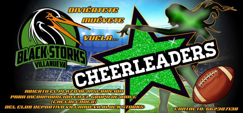 Para la campaña 2017/2018, además de poder inscribirte al Flag Football en categorías senior y cadete (a partir de 14 años), el club deportivo Villanueva Black Storks ofrece la posibilidad de apuntarte a la modalidad de Cheerleading y baile. Será también una actividad mixta donde chicos y chicas podrán aprender diferentes tipos de baile y coreografías para convertirse en el primer grupo de Cheerleaders en Extremadura, que animarán cada uno de nuestros partidos y eventos de Football, al más puro estilo americano.