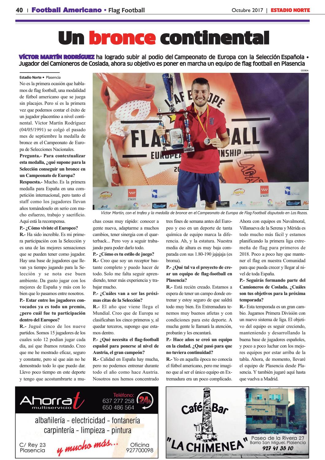 En la revista deportiva “Estadio Norte” publicaron este mes una entrevista a Víctor Martín Rodríguez, jugador de fútbol americano en Camioneros de Coslada y de Flag Football, que esta temporada ha iniciado el proyecto en su ciudad natal, Plasencia Ducks. En dicha ciudad hace varios años se atrevieron un grupo se atrevió con esta modalidad, pero no siguió adelante.