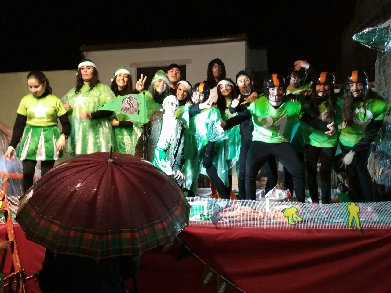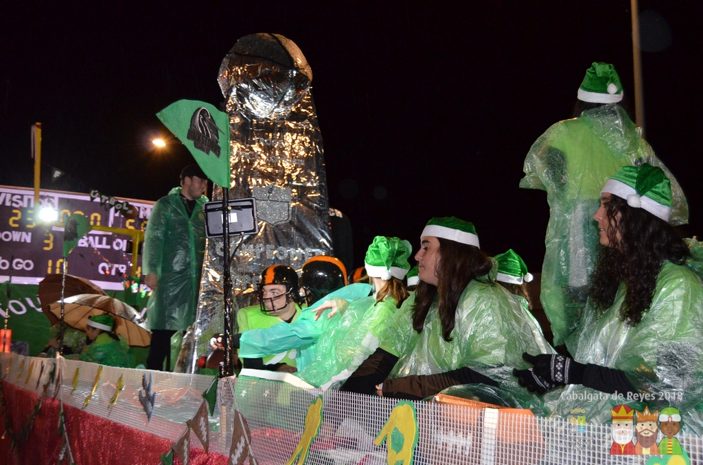 Parte de nuestros jugadores/as, animadores/as y soci@s se montaron en la carroza disfrazados de jugadores de fútbol americano o de cheerleader, para ambientar y repartir caramelos durante la ruta de la Cabalgata. Bailaron, saltaron, lanzaron caramelos, gritaron y disfrutaron como niños formando parte de esa noche mágica en la que se distribuye tanta ilusión entre los más pequeños ante la inminente llegada de los Reyes Magos a sus hogares.