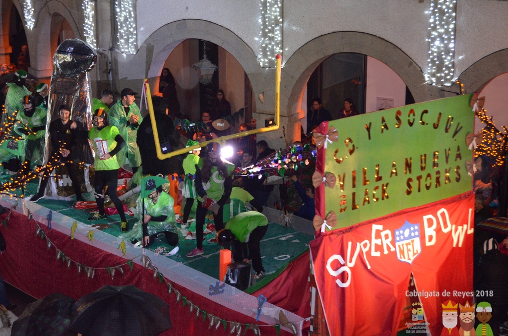 Así, la Asociación Juvenil Black Storks participó por primera vez en esta Cabalgata con una carroza cuya temática era la “Super Bowl” de Fútbol Americano, la gran final de la NFL. Se representó el campo de fútbol americano, la portería, el marcador, los cascos de este deporte, y el Trofeo Vince Lombardi en gran escala, la “copa” que levanta el ganador de la final y se proclama campeón.