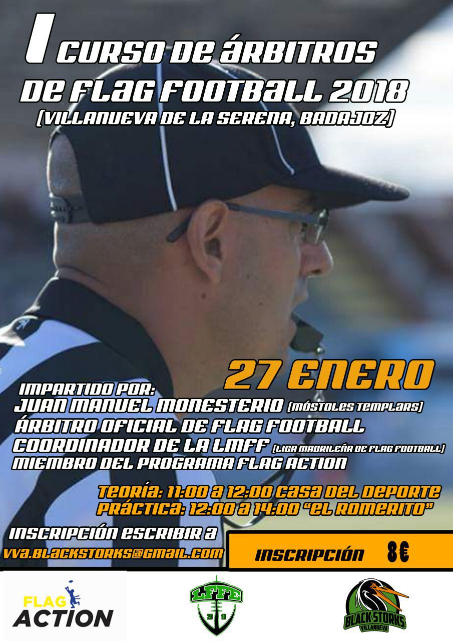 Villanueva Black Storks ha conseguido congregar a Juan Manuel Monesterio, jugador de Móstoles Templars, árbitro profesional y coordinador de la Liga Madrileña de Flag Football (LMFF), y miembro del Programa Flag Action. Juanma será el encargado de impartir el primer curso de árbitros de Flag Football para los extremeños, en semanas previas al comienzo de la primera Liga de Flag Football Extremeña (LFFE), para que los jugadores de todos los equipos de Extremadura puedan formarse y poder llevar lo más profesional posible un partido de flag desde el puesto de arbitraje que tan importante y complicado es en el deporte, especialmente en el Football.