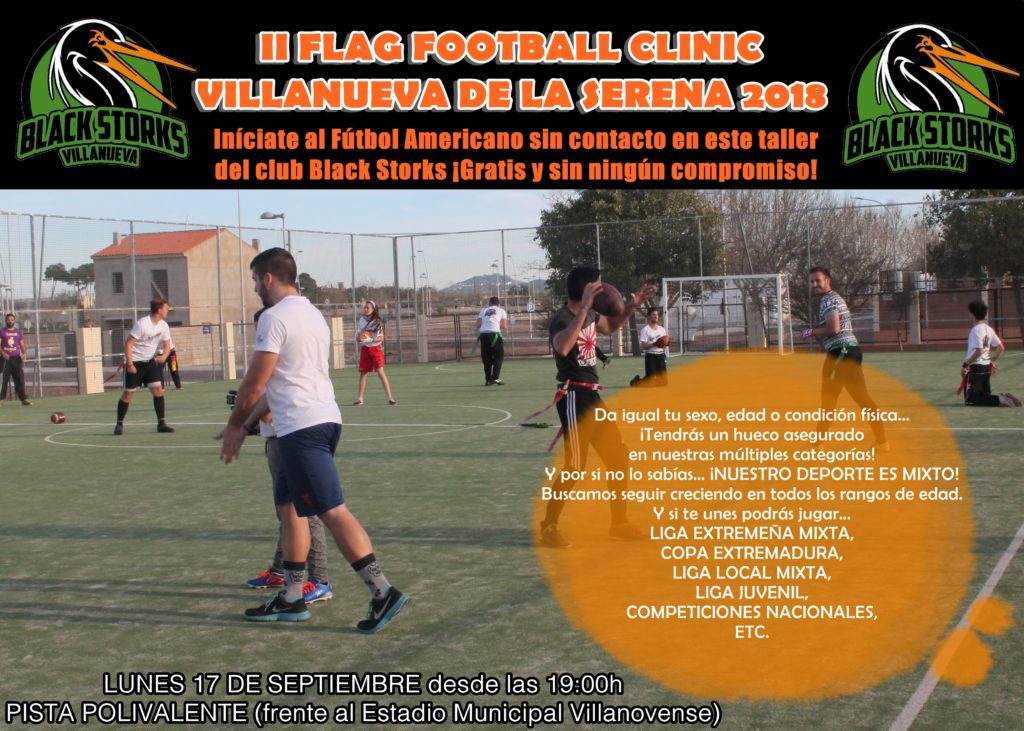 El lunes 17 de septiembre tendrá lugar la segunda edición de los Clinics organizados por el club deportivo Villanueva Black Storks de Flag Football en Villanueva de la Serena.