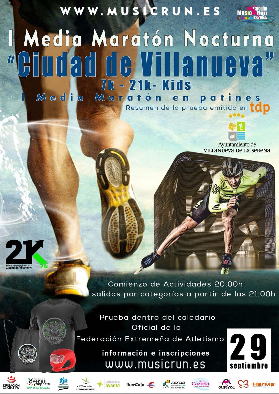 La Plaza de España acogerá el sábado 29 de septiembre, la I Media Maratón Nocturna Ciudad de Villanueva. Se trata de la última prueba del circuito Music Run de España, recogida dentro de la Federación Extremeña de Atletismo y a la que pueden participar tanto federados como no federados. Como siempre, habrá dos circuitos, uno para niños de hasta 12 años y otro para adultos con un recorrido de 7 o 21 km (tres vueltas).