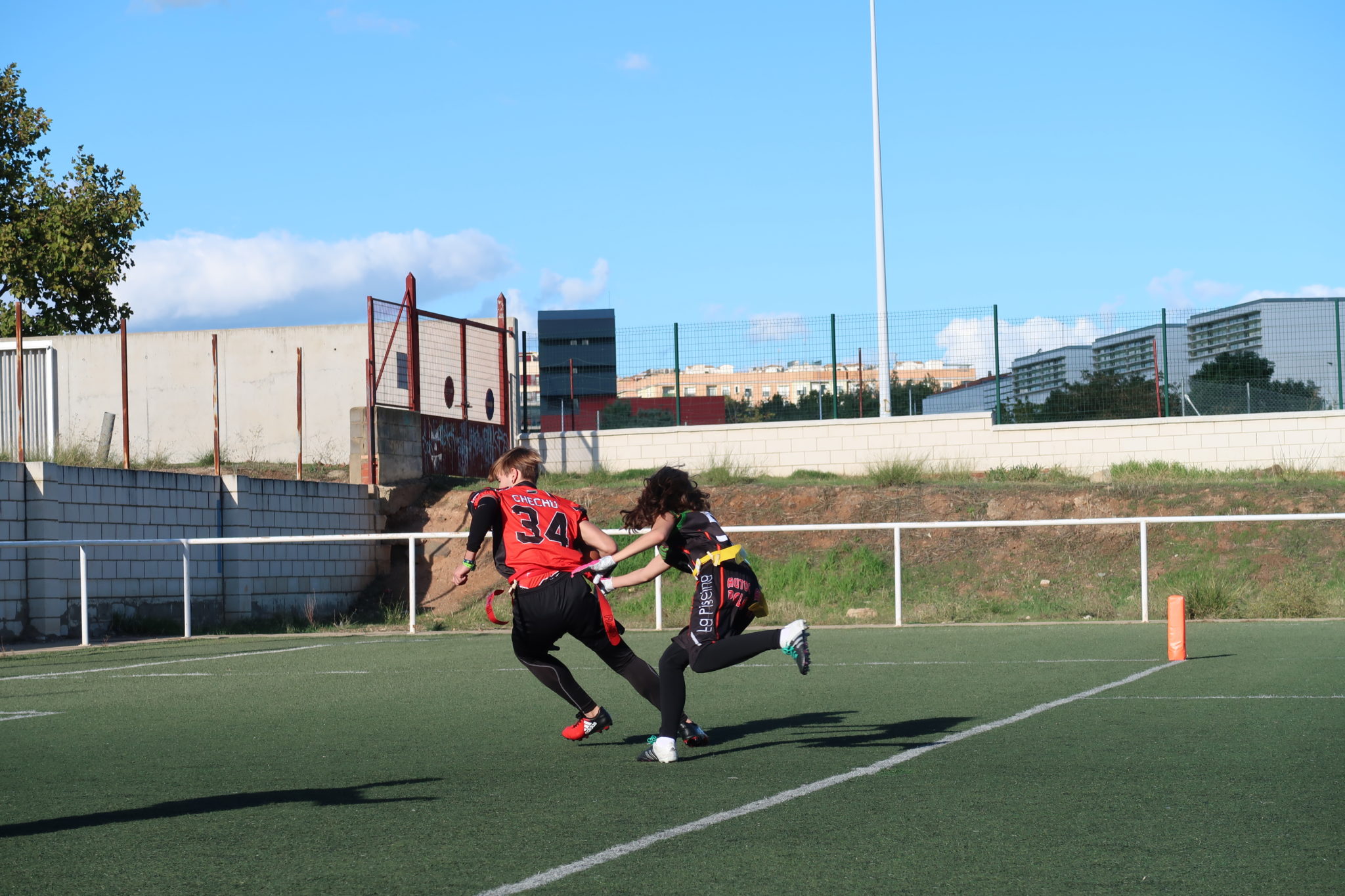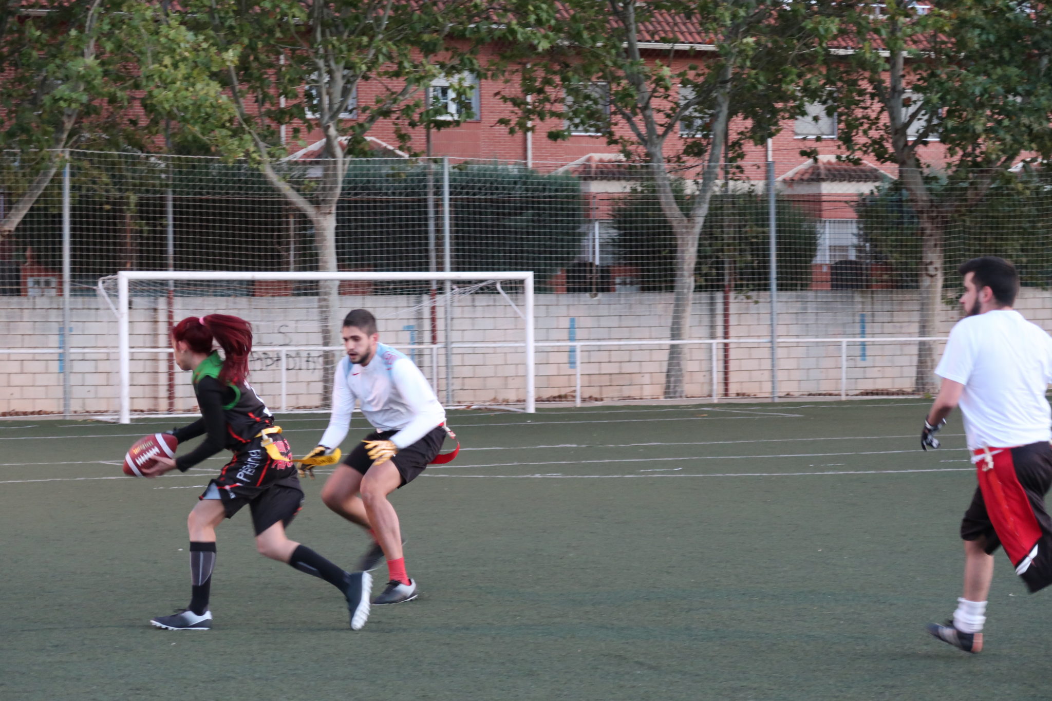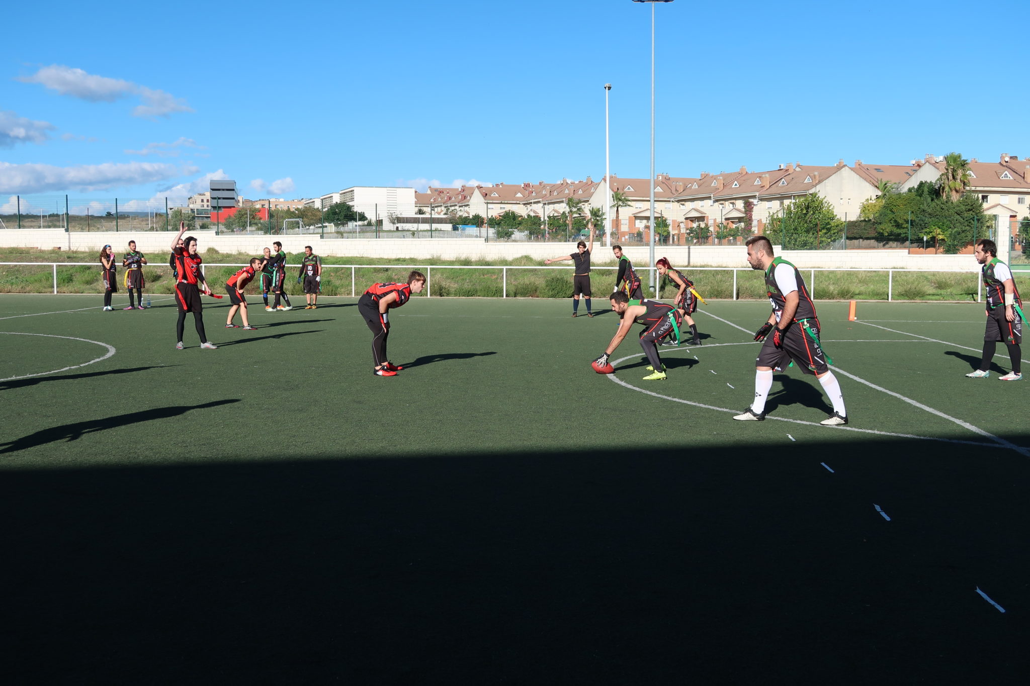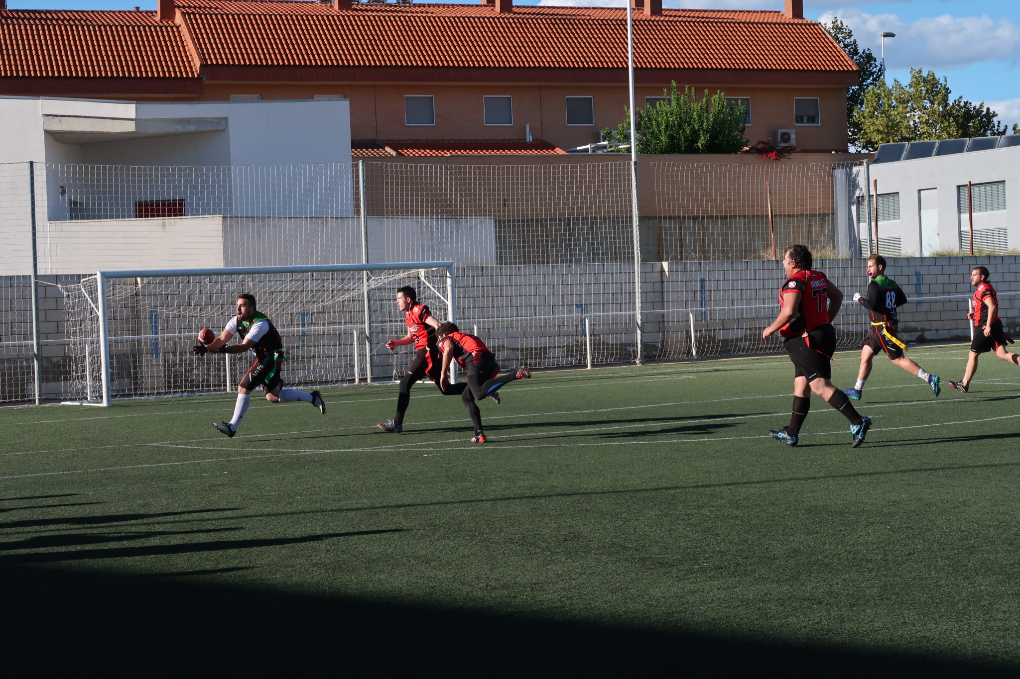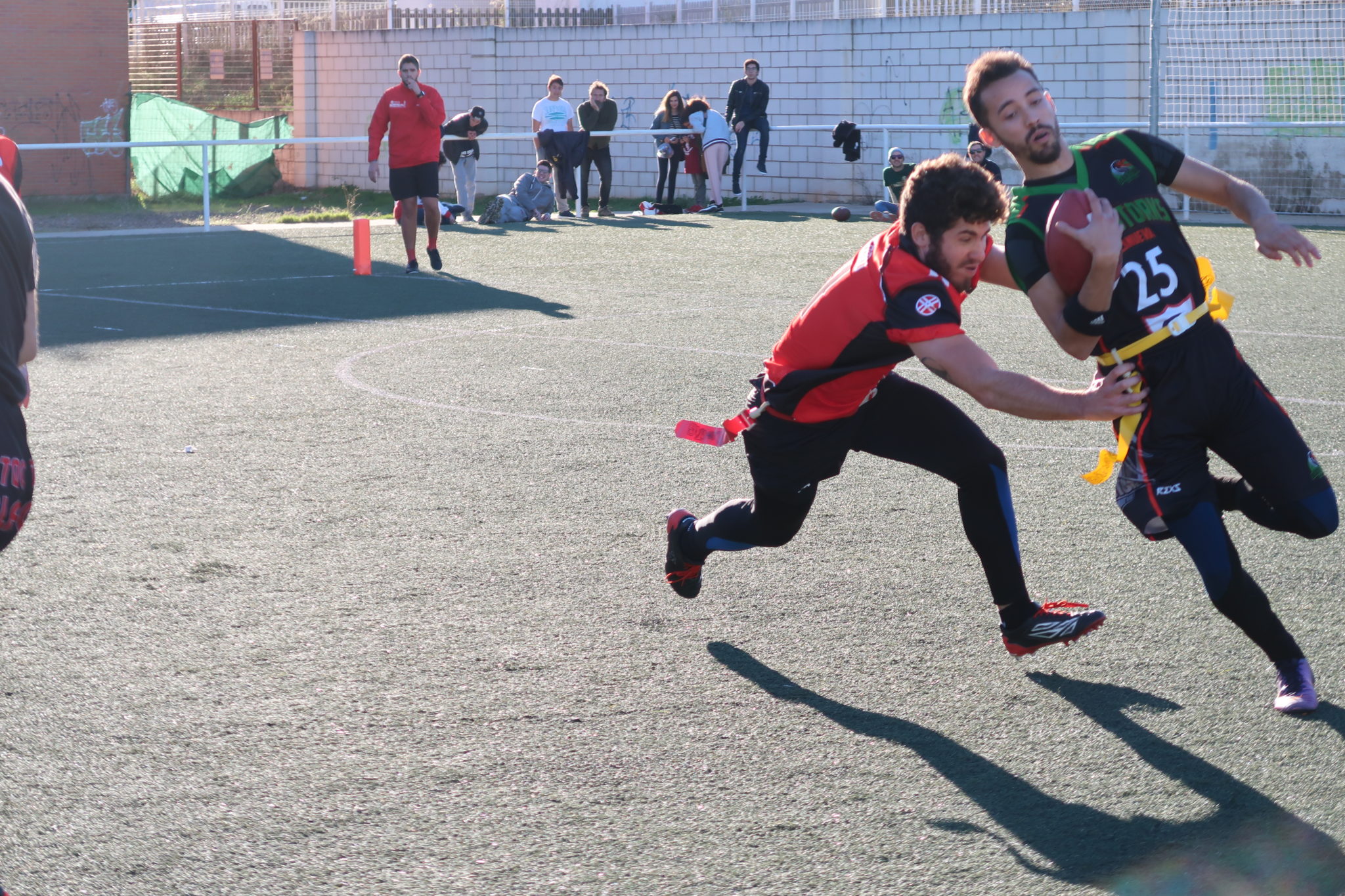 Nuestro primer encuentro fue con el grupo de Mérida, ante los que jugamos un partido vibrante que acabó a nuestro favor por 19-20. A pesar de ello, arrancamos fríos desaprovechando que teníamos la primera posesión y recibiendo en defensa un rápido touchdown por una jugada larga de carrera, con conversión incluida.