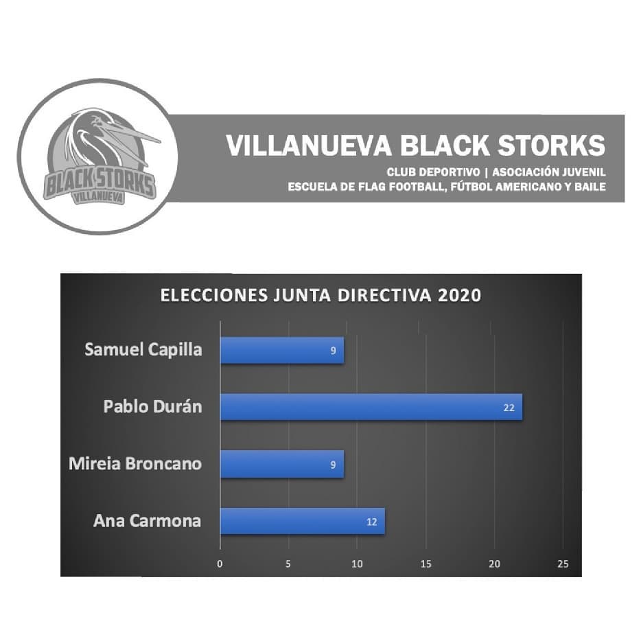 Ana Carmona y Pablo Durán son l@s nuev@s miembros de la Junta Directiva de la Asociación Juvenil y Club Deportivo Villanueva Black Storks. Felicitar a los ganadores y gracias tanto a Samuel Capilla como a Mireia Broncano por mostrarse como posibles candidat@s. También agradecer a todos l@s soci@s que participaron y se acercaron a votar (26 votantes de 40 socios).