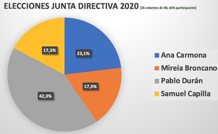 Pablo obtuvo el 42’3% de los votos, Ana el 23’1% y Samuel y Mireia empataron con el 17’3%. Así, Pablo y Ana completarán a partir de ahora la Junta Directiva como vocales junto a Víctor Calle (Presidente), Antonio Segador (Secretario), Alejandro Pastor (Vicepresidente) y David Capilla (Tesorero), quienes mantienen sus cargos.