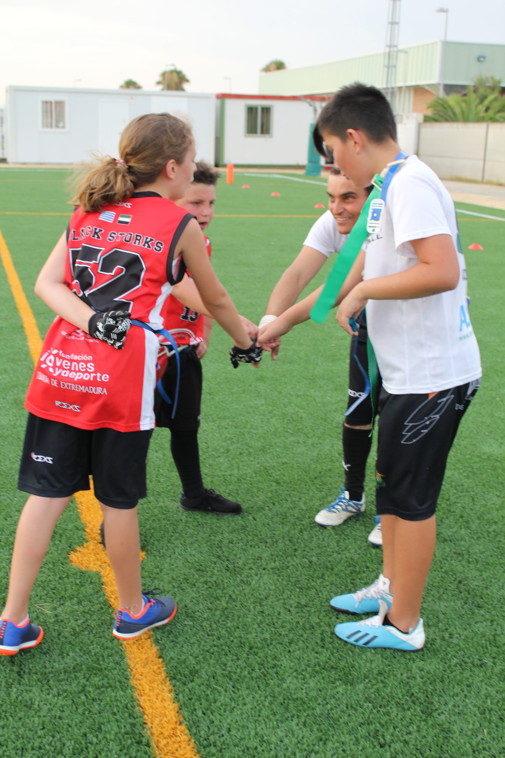 Red StorksEra turno ahora de que debutaran los más pequeños. Y a pesar de ser nuevos en su mayoría y de la complejidad de este deporte cuando te inicias en él, nos maravillaron con un emocionante partido en el que apenas tuvieron errores y faltas. Red Storks se llevó este primer duelo por 18-13, gracias a tres intercepciones consecutivas que realizaron en la primera parte y que pusieron muy cuesta arriba el partido a Blue Storks. Aunque estos no se intimidaron y muy cerca estuvieron de darle la vuelta al marcador.