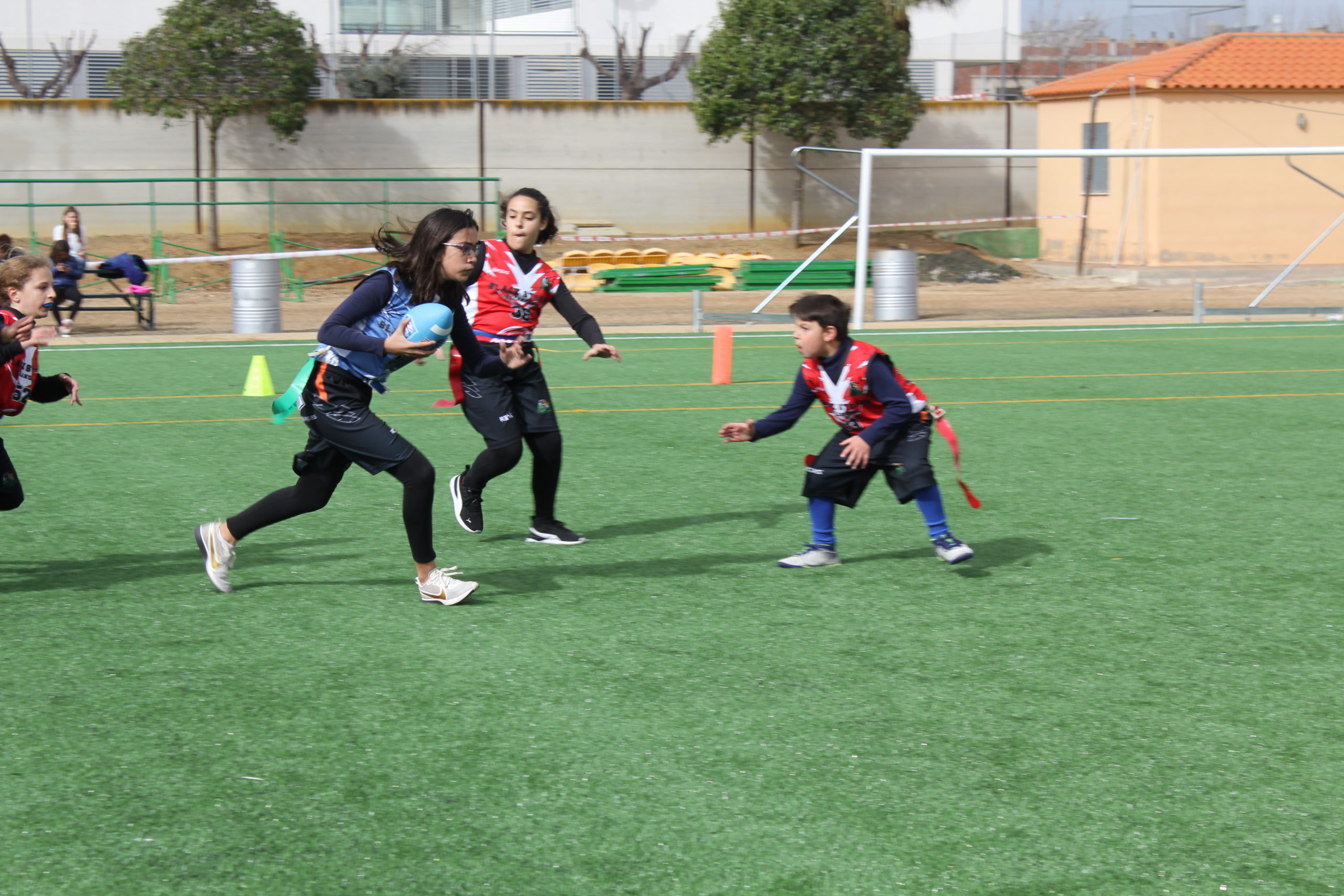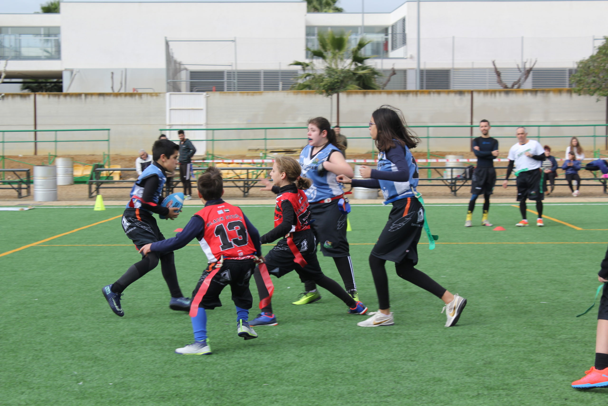 Con ello, en la primera mitad, tras una intercepción de Joaquín, los Blues lograron llegar a la zona de anotación, con un pase de touchdown de Paula hacia el propio Joaquín. Previamente interceptaron Gloria y Cintia.