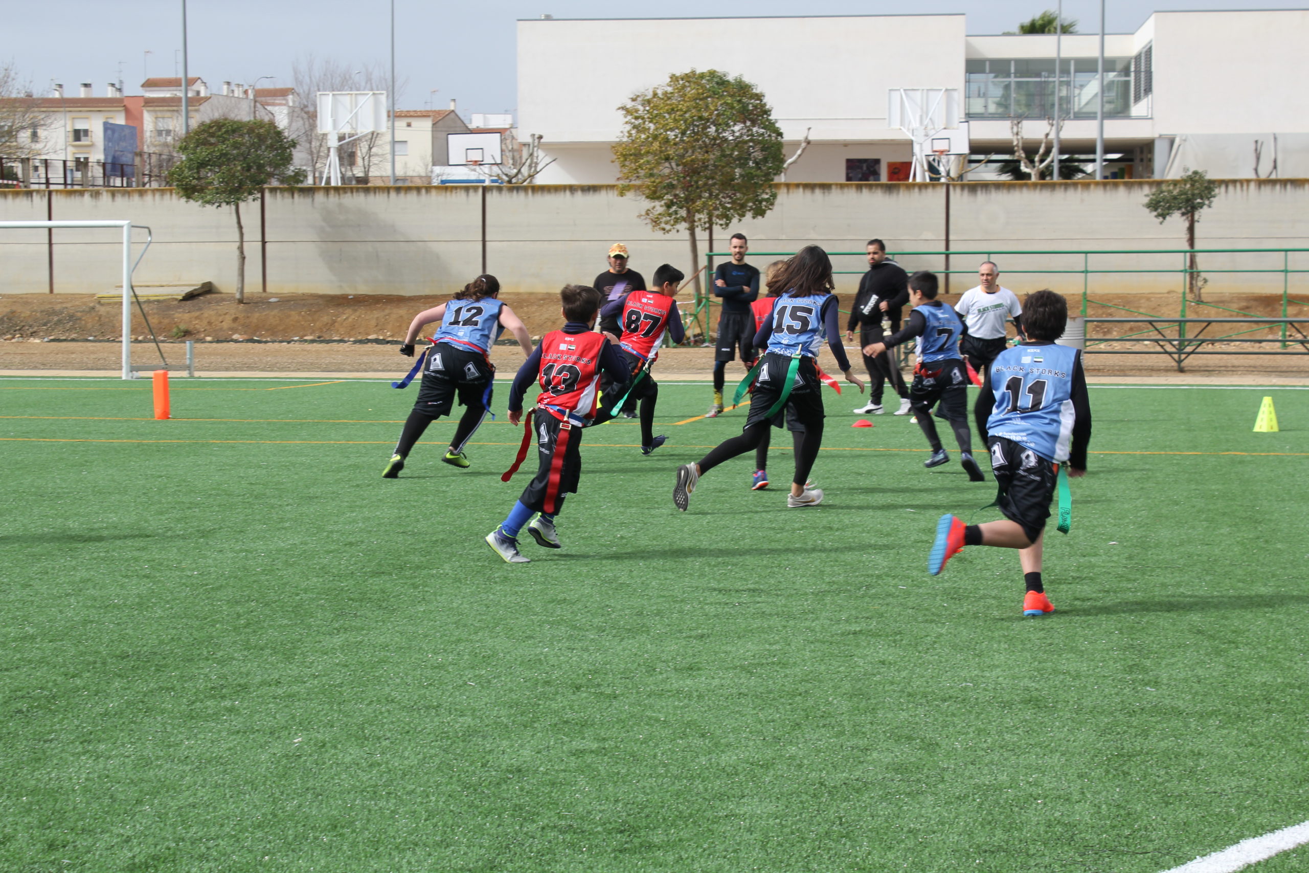 Por su parte, Red Storks también logró varios cambios de posesión, dos de Santiago y uno de Ángela. Pero la defensa de Blue Storks invalidó cualquier amenaza ofensiva. Tanto es así que en la segunda parte no hubo más puntos, manteniendo a Reds alejados de la endzone y los Blues controlando el partido con sus jugadas de carrera que se alternaban entre Fermín y Joaquín.