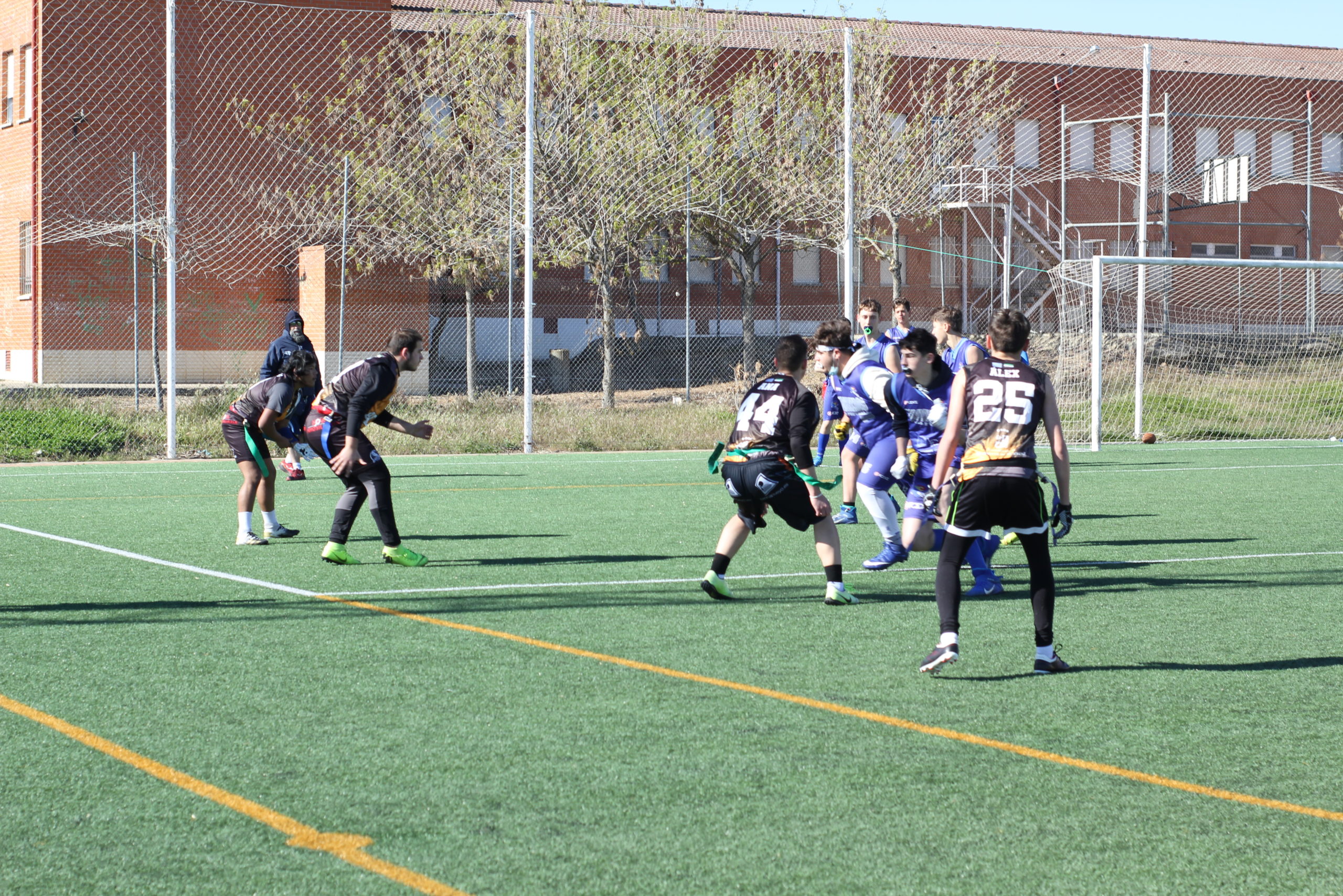 En primer lugar vamos a contaros el torneo júnior que fue más corto. Abrió la competición nuestro equipo frente a Ávila Grizzlies, club al que tenemos como ya sabéis especial cariño y relación. Empezaban fríos los nuestros, recibiendo el quarterback Juan Gallego en su segundo partido como QB, una intercepción tempranera. Y Ávila era quien habría el marcador tras ese turnover, 0-6. No obstante, los grandes avances conseguidos en ataque con las recepciones de Emilio Gallego y Juan Pedro catapultaban a una ofensiva que respondía de inmediato, con touchdown del propio Emilio.