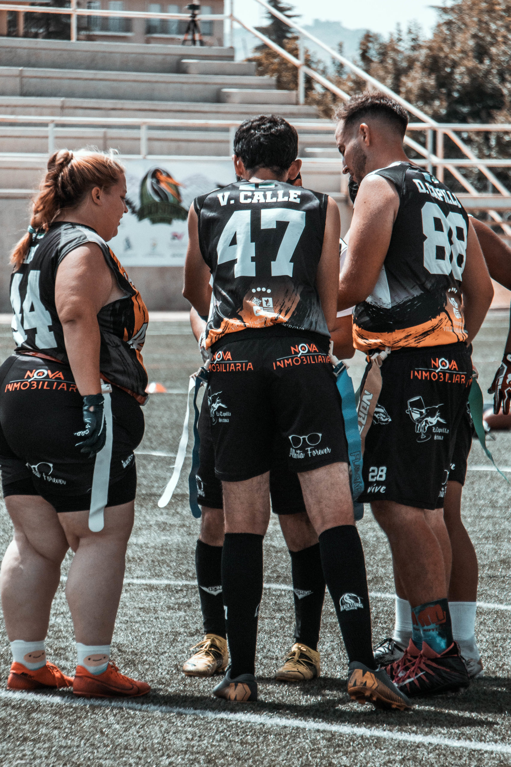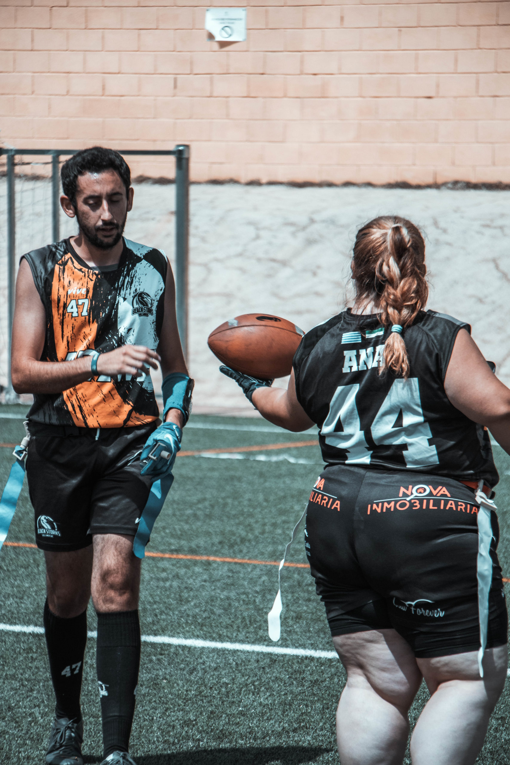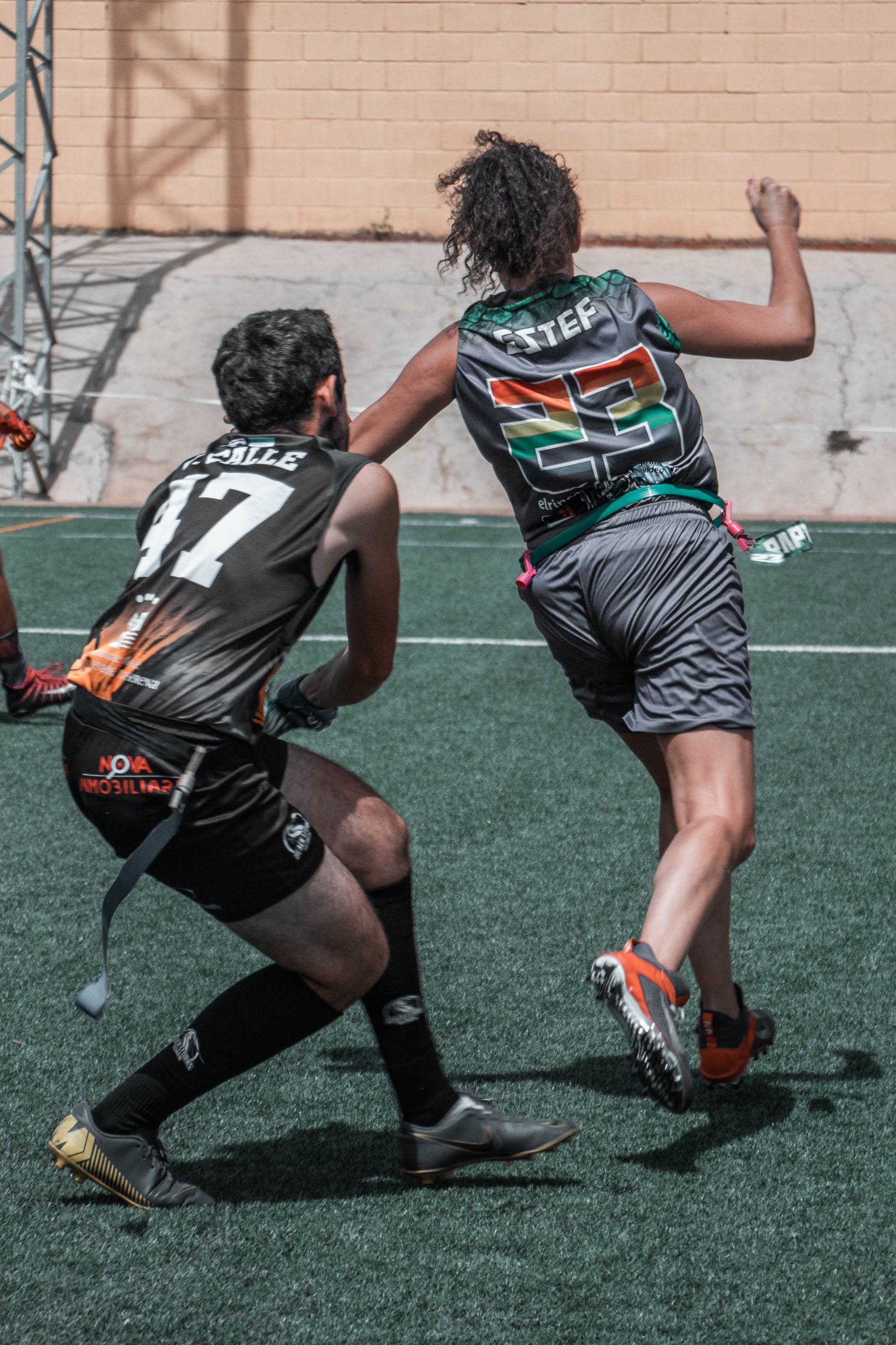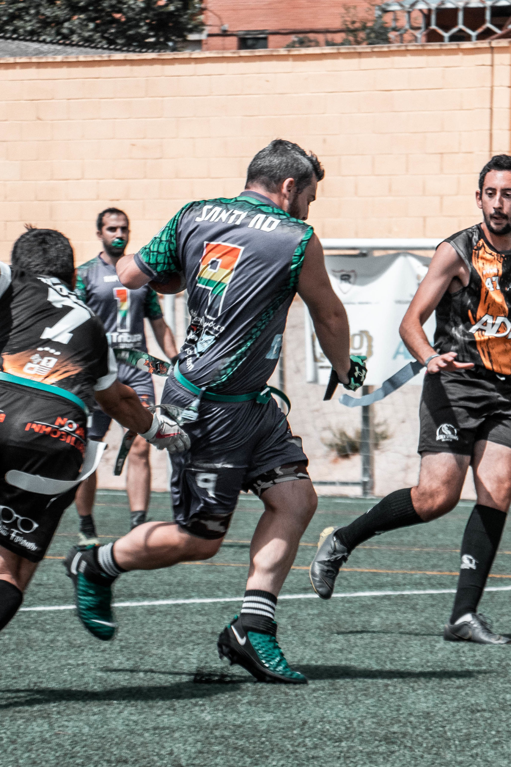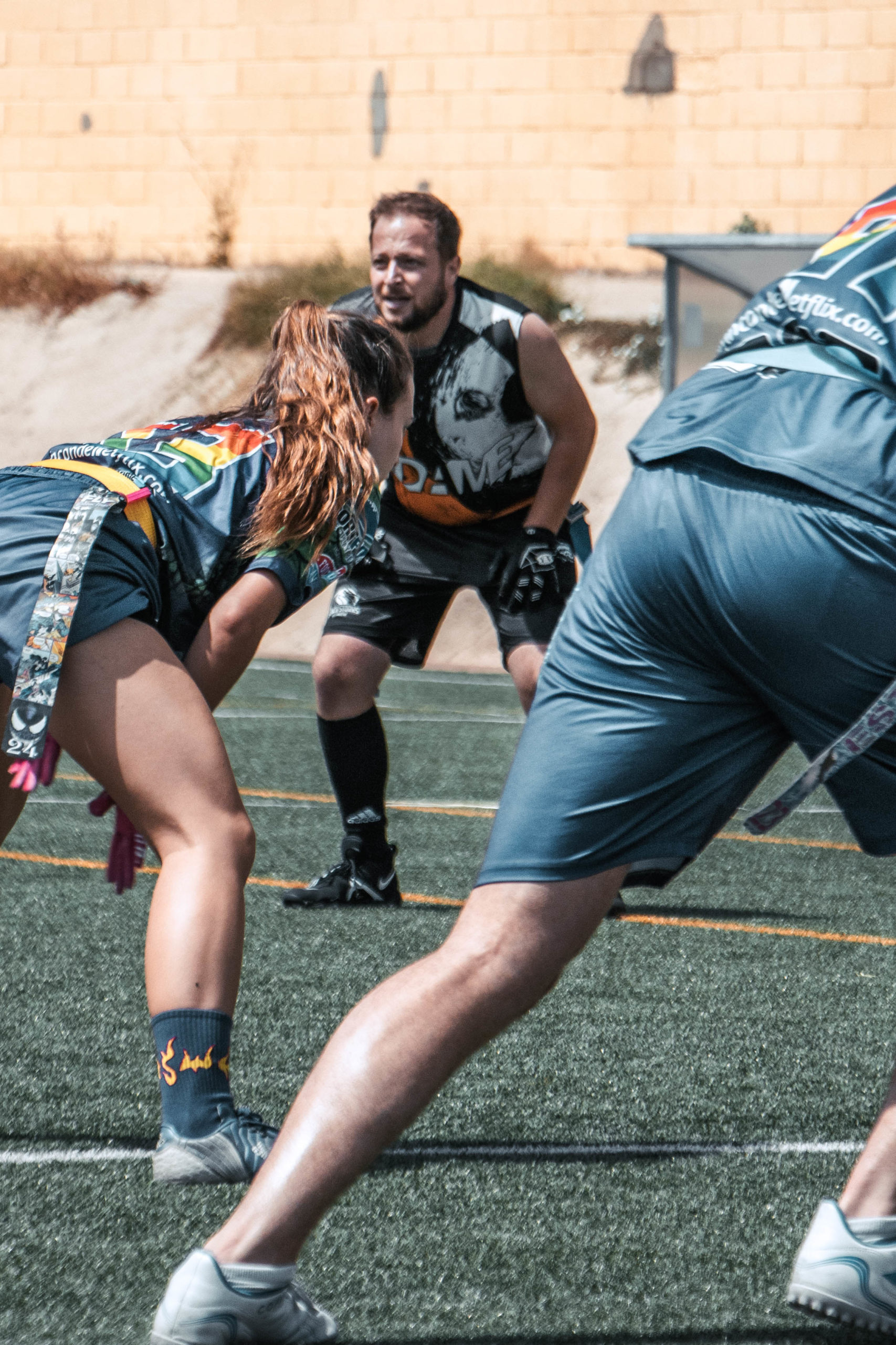 Pero se iban a topar con nuestra gran defensa que a partir de la tarde estaría exultante. La gran culpable de que acabáramos llevándonos la novena plaza. Y eso que Víctor Calle, líder de la defensa desde hace varias temporadas, solo pudo jugar como QB por molestias y lo sustituyó a la perfección el joven linebacker Álex León. Dani Casado como cornerback no permitió prácticamente ni una sola recepción profunda, mientras que Alonso Mendoza y David Capilla se complementaron a la perfección, llegando a interceptar hasta en cuatro ocasiones entre ambos. Y en ataque, Ana Carmona y Juan Gallego se mostraron incondicionales con sus recepciones junto a sus compañeros más veteranos, como David y Alonso.