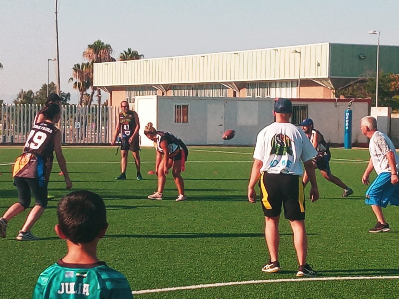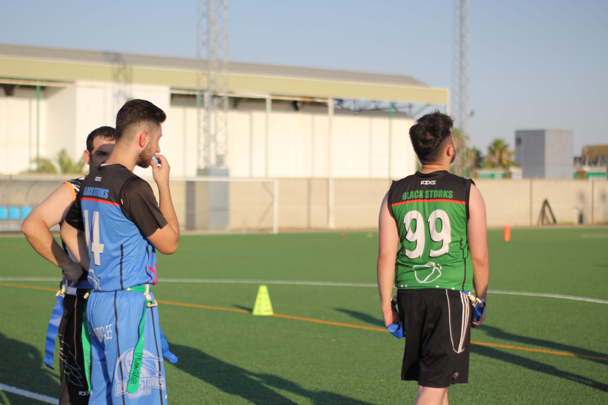 El equipo con familiares de la jugadora Yakira Rodríguez, un grupo prácticamente completo de habitantes del pueblo cercano de Entrerríos, los Entrerríos Sons of Death. Algunos pequeños dirigiendo a los grandes como el equipo de Fermín García de Black Storkcitos, con Ángel García de QB y Alfonso Ruiz que volvía de su lesión o Juan Gallego de receptores. O lo más esperado de este quinto aniversario, el intento que hicimos por vivir un reencuentro con jugadores que han pasado por nuestro club en los últimos años. Ángela Loné dirigió muy bien al equipo de Old School Storks, donde pudimos reencontrarnos con Juanan, Juanfran, Juanjo “JJ” o Luismi. Una pena todos aquellos que querían y finalmente les fue imposible venir al torneo.