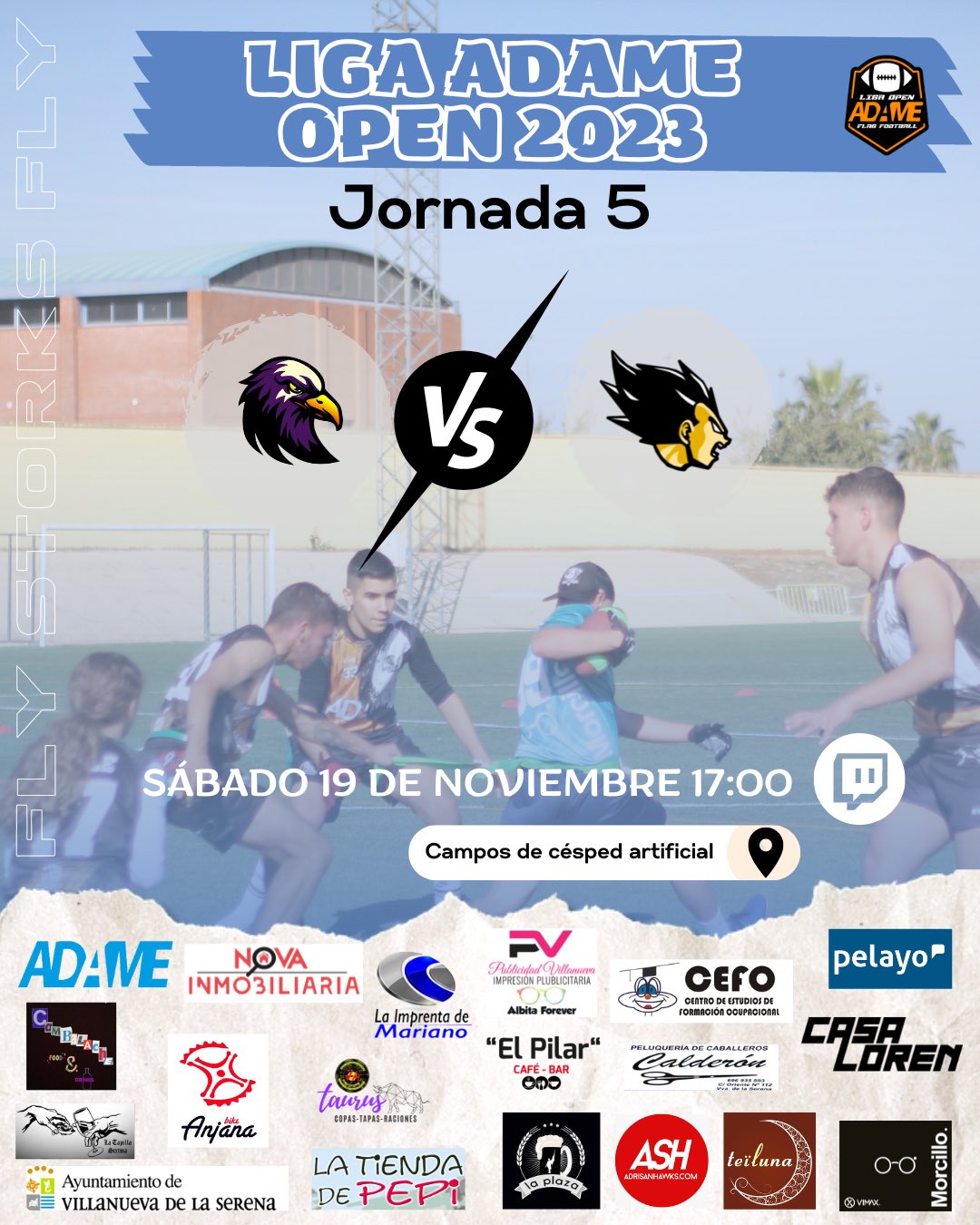 Vamos ya con la quinta y penúltima jornada de la V Liga ADAME Open de Flag Football 2023. Un partido clave para determinar esa primera plaza en la clasificación que otorga el pase directamente a la final de los Playoffs. Saiyans Raptors se vuelven a ver las caras este sábado 19 de noviembre desde las 17:00h en los campos de césped artificial junto al Anexo Municipal Villanovense.