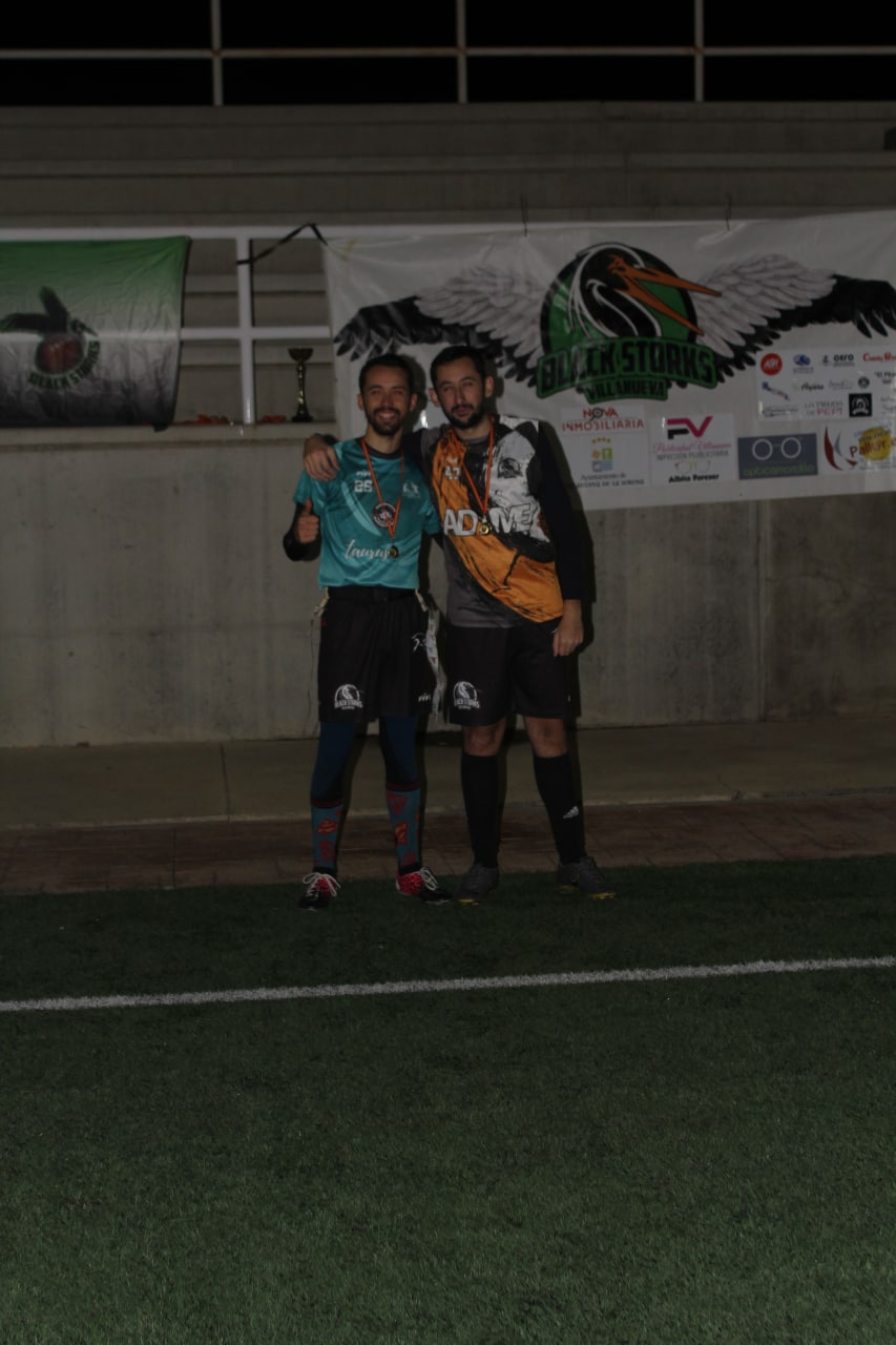 Este sábado también tuvimos la habitual entrega de medallas y trofeos. Tercer clasificado sería Spartans, nuevamente subcampeones Saiyans y la copa la volvieron a levantar los Raptors. El MVP de toda la competición se lo llevó el gran regreso de la temporada, el incondicional Álex Pastor que ha estado casi dos años de baja y ha vuelto en este curso a su cien por cien. Como quarterback de Saiyans, ha repartido en total 7 pases de touchdown y ha sumado 6 anotaciones con sus carreras, siendo el tercer máximo anotador de esta V Liga ADAME con 36 puntos. Lo superaron únicamente Jaime Arjona (40 puntos) y Álex Márquez (38), ambos jugadores de Raptors.