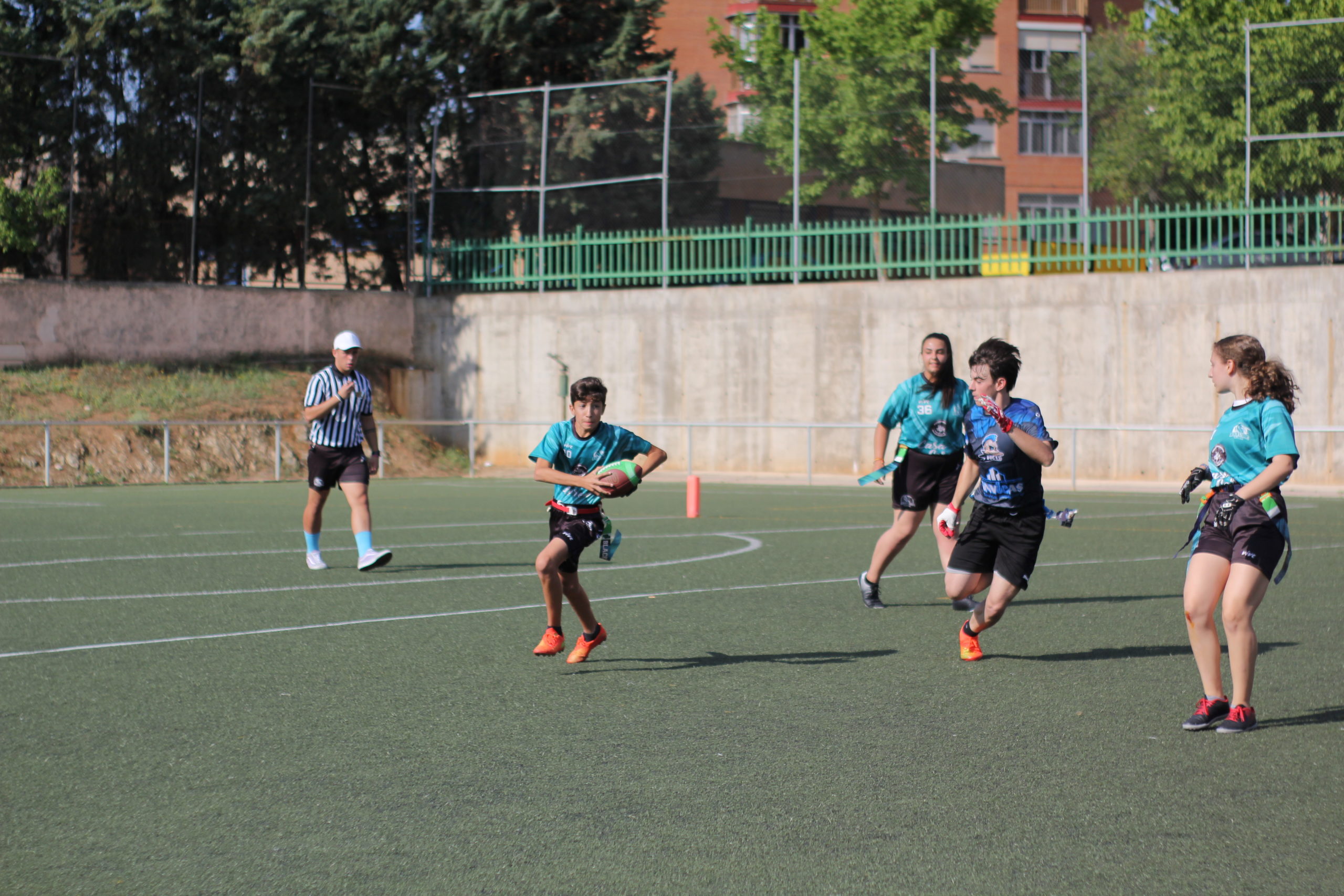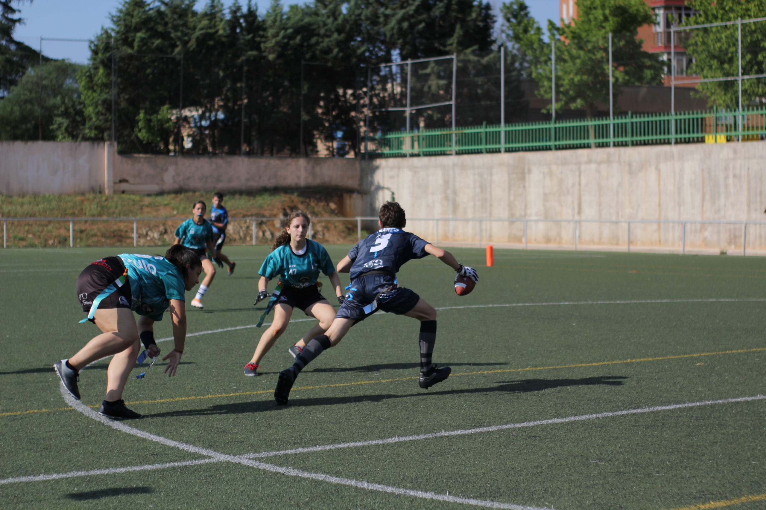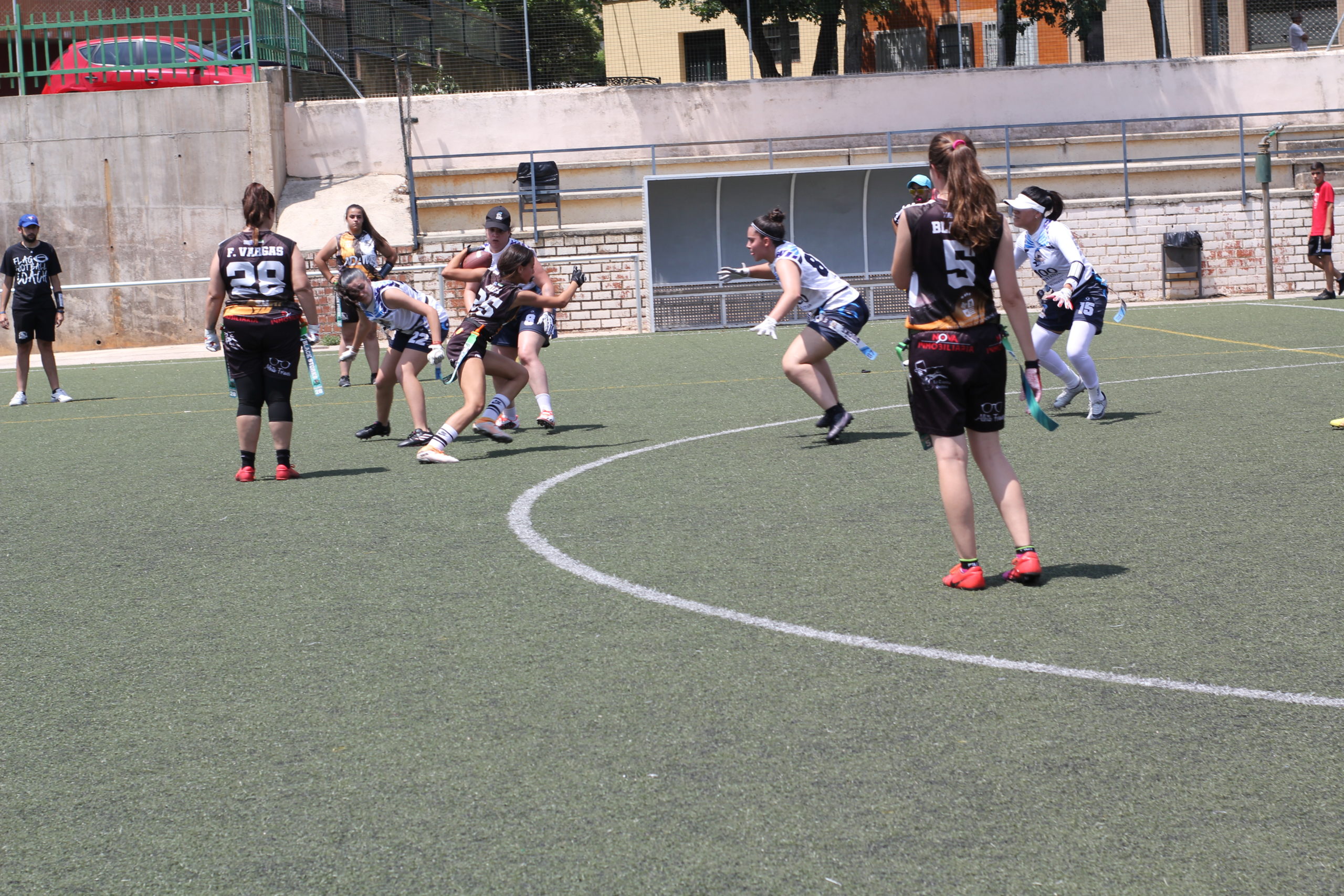 Se abría la mañana con el duelo de los más jóvenes, y los nuestros empezaron muy enchufados. La defensa paró a los Ducks y el ataque avanzó sin problemas rematando María del Mar pasando a la center Ángela Loné en la endzone, quien también añadiría el extra point. Sin embargo, los placentinos iban a comenzar a hacernos daño en defensa con sus explosivas carreras y con ello pusieron el 7-6 en el marcador.