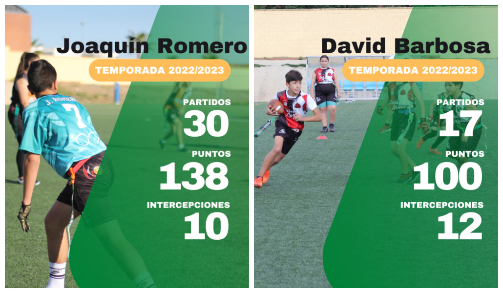 El Top-5 de anotadores es espectacular. Como tercero tenemos a Joaquín Romero que no para de progresar y mejorar y apenas tiene ahora 14 años. Ha logrado 138 puntos (22 TDs, 6 extras). David Capilla (112 puntos con hasta 16 extra points) y David Barbosa (100 puntos) se hacen notar como jugadores claves en los ataques de los equipos de sus categorías. Además, de estos cinco jugadores vemos ya a cuatro en la clasificación global de toda la historia de Black Storks de máximos anotadores: