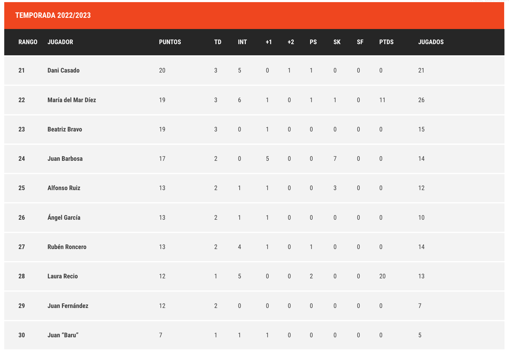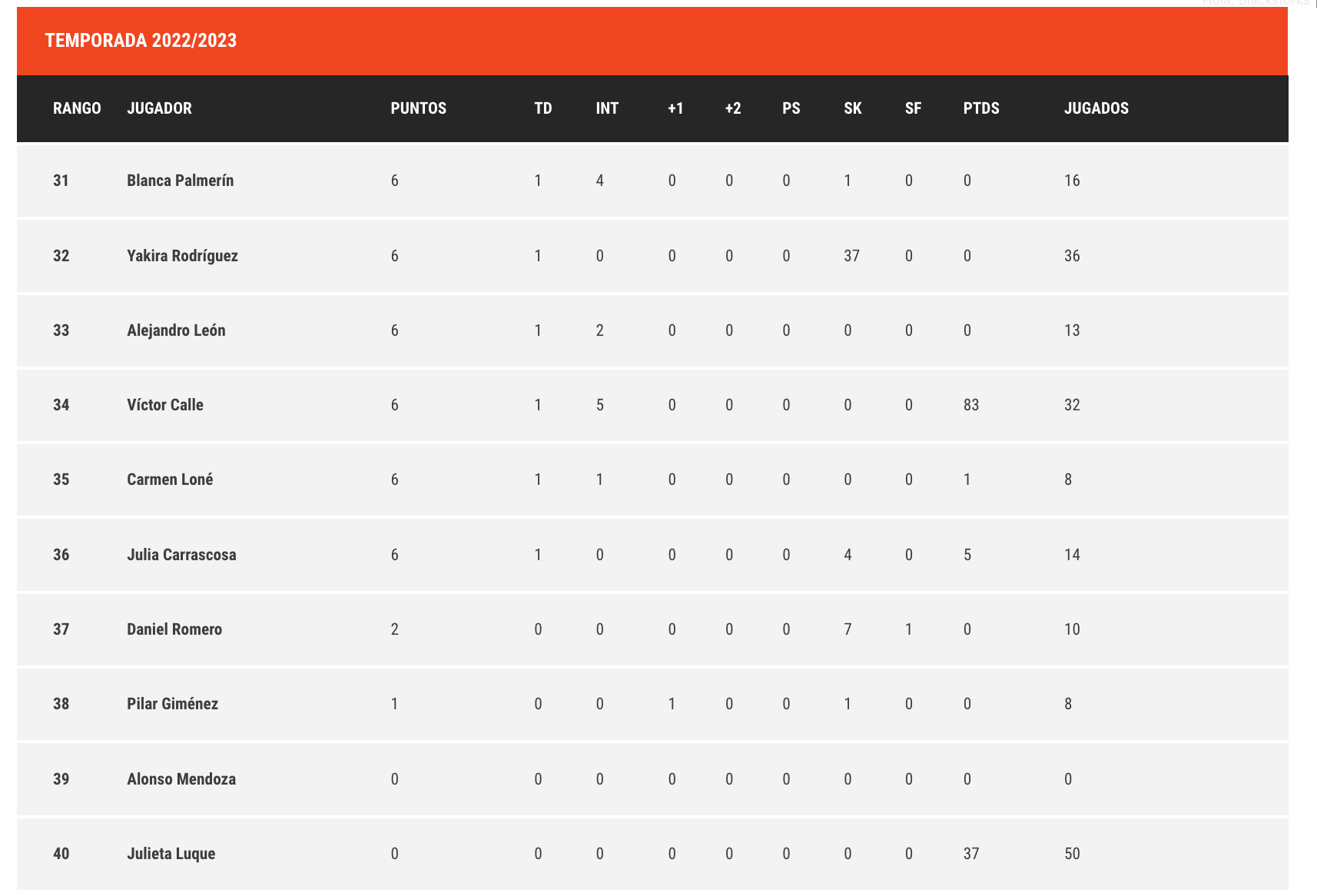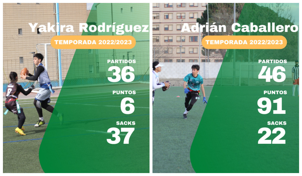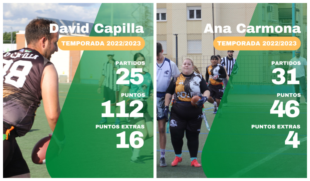 Si miramos solo el apartado femenino, en categoría senior destaca Ana Carmona con 7 touchdowns y 4 extras (46 puntos). Y entre las juveniles nos llenamos de orgullo al resaltar a dos jugadoras que HAN SIDO INCLUIDAS EN LA CONVOCATORIA DE LA SELECCIÓN ESPAÑOLA DE FLAG FOOTBALL SUB15, Ángela Loné (63 puntos) y Adriana Frías (29).