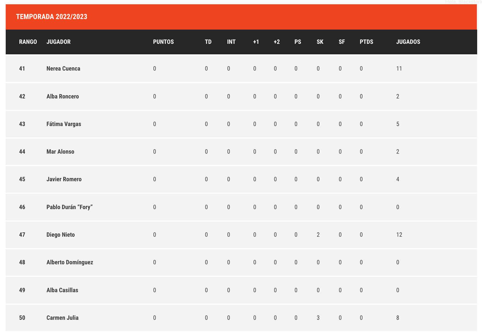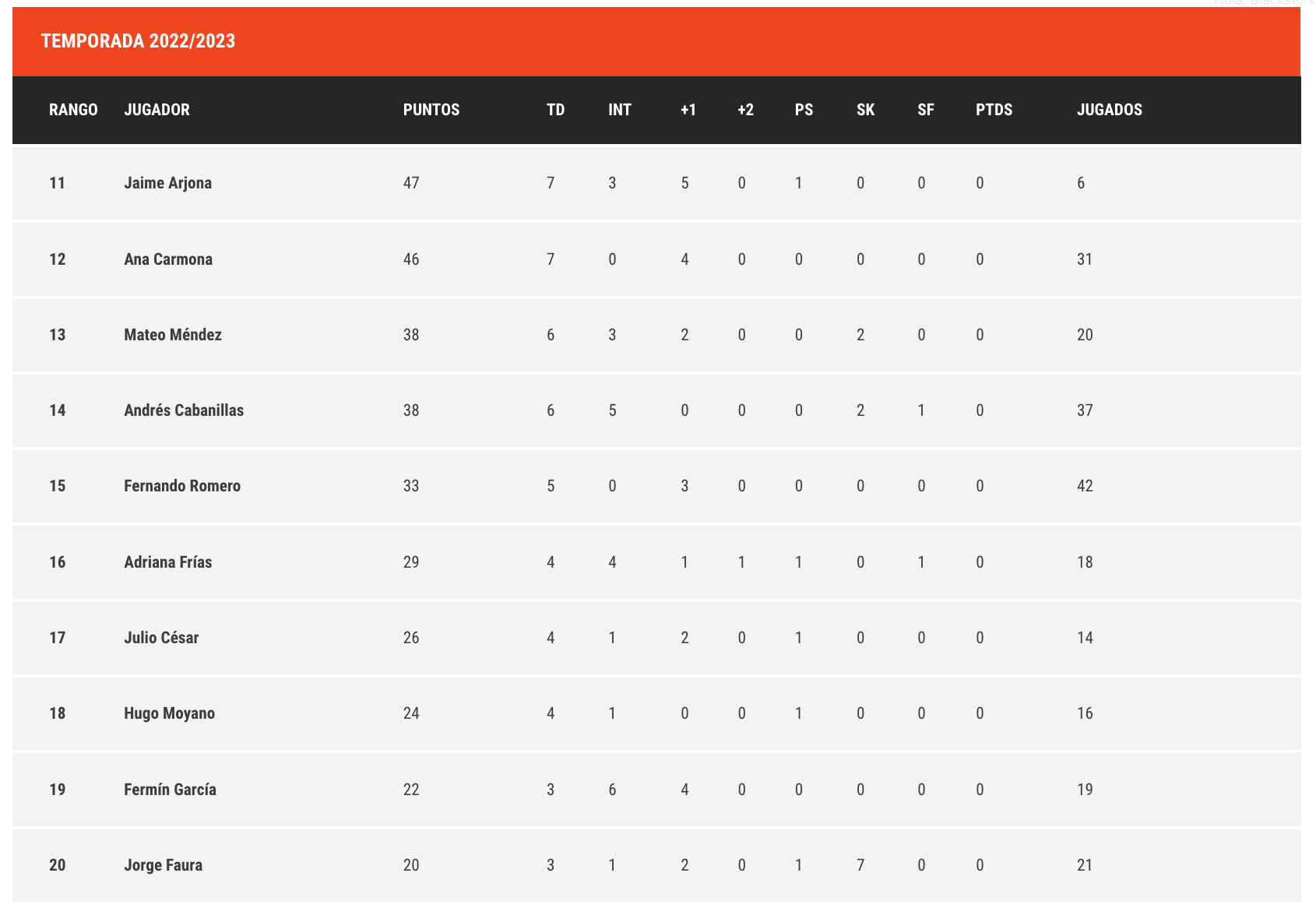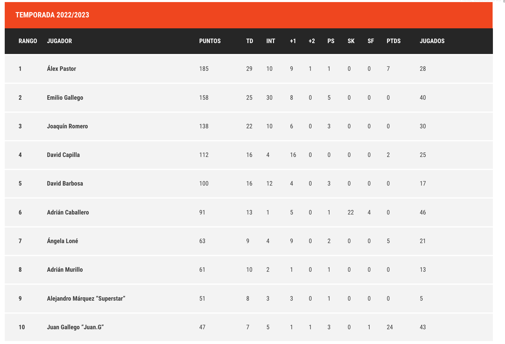 Si miramos solo el apartado femenino, en categoría senior destaca Ana Carmona con 7 touchdowns y 4 extras (46 puntos). Y entre las juveniles nos llenamos de orgullo al resaltar a dos jugadoras que HAN SIDO INCLUIDAS EN LA CONVOCATORIA DE LA SELECCIÓN ESPAÑOLA DE FLAG FOOTBALL SUB15, Ángela Loné (63 puntos) y Adriana Frías (29).