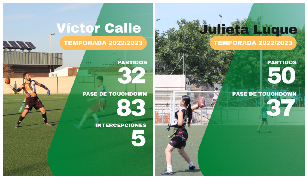 Por último, los quarterbacks habituales han sido Víctor Calle, que se ha ido hasta los 83 pases de touchdown en la temporada, y Julieta Luque, con 37 envíos a la endzone. Juan Gallego, Laura Recio, María del Mar Díez, Álex Pastor, Julia Carrascosa y Ángela Loné han sido los demás jugadores que han ejercido de QB durante esta temporada. Y en cuanto a partidos, los cadetes se han hinchado a jugar. Al menos 40 encuentros han disputado este año Julieta Luque (líder con 50), Adrián Caballero (46), Juan Gallego (43), Fernando Romero (42) y Emilio Gallego (40).