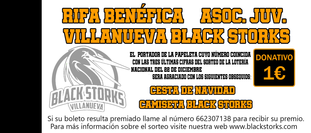 Se da un plazo de quince días para que el premiado contacte de cualquier forma con nosotros. Facilitamos dos números de contacto: 618 427 464 y 662 307 138. En cuanto aparezca el ganador, le haremos llegar a su domicilio todo el premio. Si la papeleta no fuese vendida, se otorgará el premio al que ostente las tres últimas cifras del segundo premio de la Lotería de Navidad, y en caso de seguir sin aparecer un ganador, se asignará al portador de las tres últimas cifras del tercer premio. Como último recurso, si sigue sin aparecer un ganador, se dará el premio al socio Black Storks que vendió la papeleta premiada.