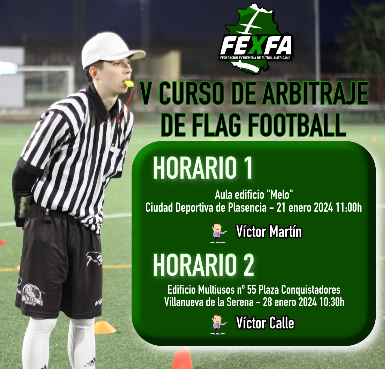 El próximo domingo 28 de enero desde las 10:30h de la mañana tendrá lugar un nuevo curso arbitral de flag football en Villanueva de la Serena. Lo acogeremos en nuestra sede del club, en el Edificio Multiusos (nº 55) de la Plaza de los Conquistadores.
