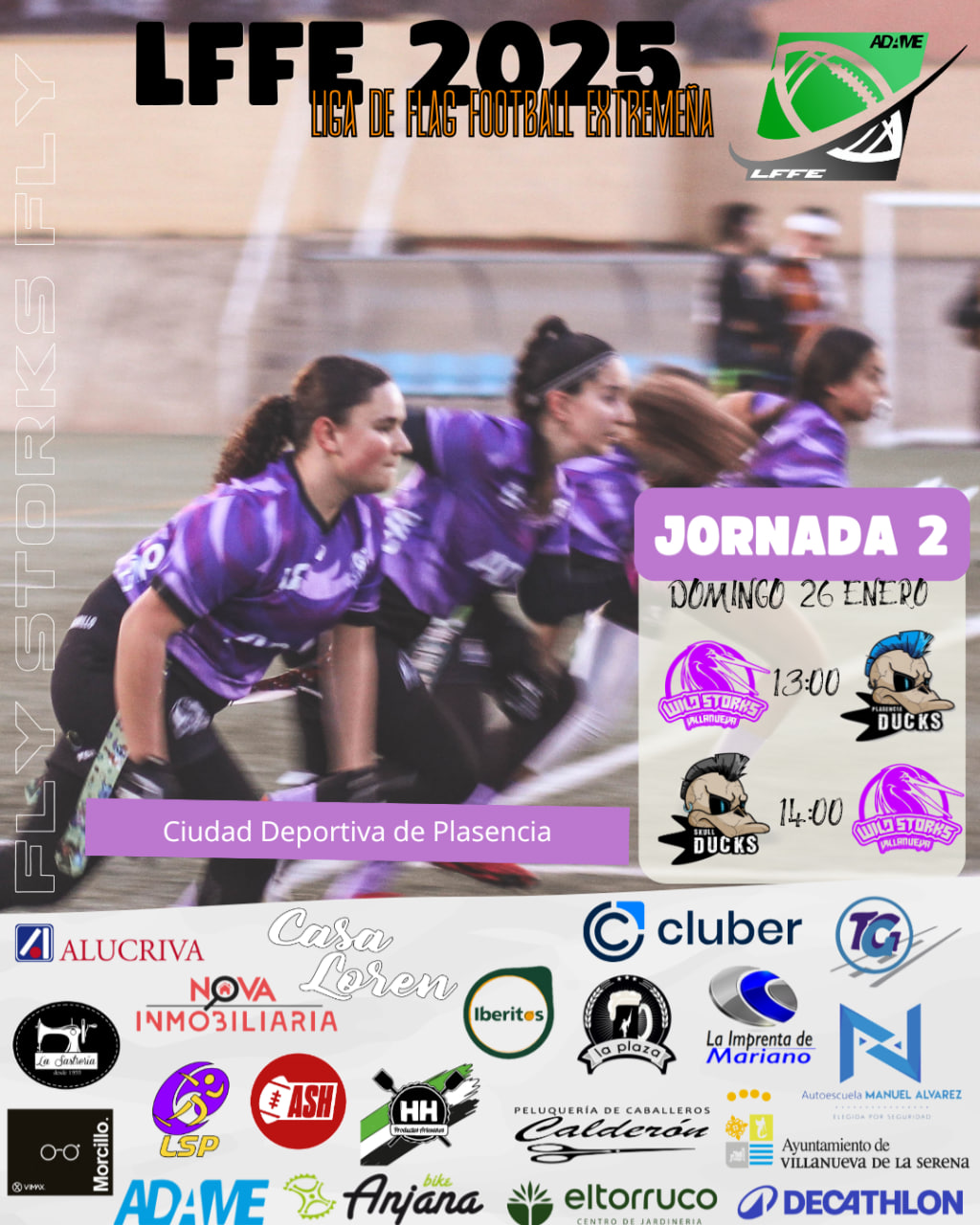 Fin de semana cargadísimo de flag football en nuestro club deportivo Villanueva Black Storks. El sábado 25 de enero desde las 18:30h, en el Anexo Municipal Villanovense, tendrá lugar por fin los esperados Playoffs de la Liga ADAME de Flag Football 2024-25. Y el domingo a partir de las 12:00h, en la Ciudad Deportiva de Plasencia, se llevará a cabo la segunda jornada de la Liga de Flag Football Extremeña 2025, donde competirá únicamente las Villanueva Wild Storks.