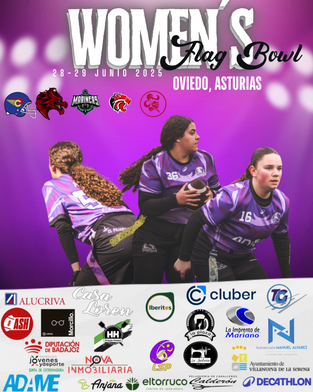 Jugaremos además con otras jugadoras amigas de otros clubes, como son Carmen y María de Aljarafe Harriers, Estela de Málaga Corsairs, y Adriana Martín, Celia Muras, Elena Georgiana y Silvia Barbero de Osas Rivas. Y nos ha tocado un grupo bastante complicado: las mejores de España, Madrid Capitals, las defensoras, Mariners, y Camioneras. En partidos de intergrupos, nos enfrentaremos a Blood Dragons y Cavaliers. Además, habrá una inédita y singular competición de categoría SUB15 femenina, entre los equipos de Oviedo Phoenix y Coslada Camioneras. Con el conjunto asturiano jugará nuestra jugadora Laura Recio.