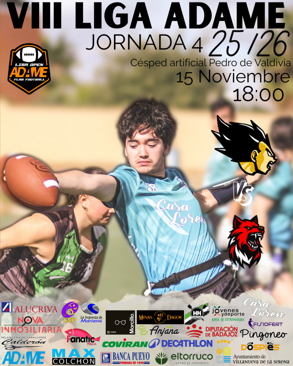 Vamos con la Jornada 4 de la VIII Liga ADAME de flag football villanovense 2025, iniciando ya los partidos de vuelta. Se reencontrarán los finalistas del 2024 y de los que en su duelo de ida quedó todo por decidir, pues quedaron en empate a doce puntos. Underdogs y Saiyans se enfrentarán este sábado 15 de noviembre en el césped artificial Pedro de Valdivia desde las 18:00h.