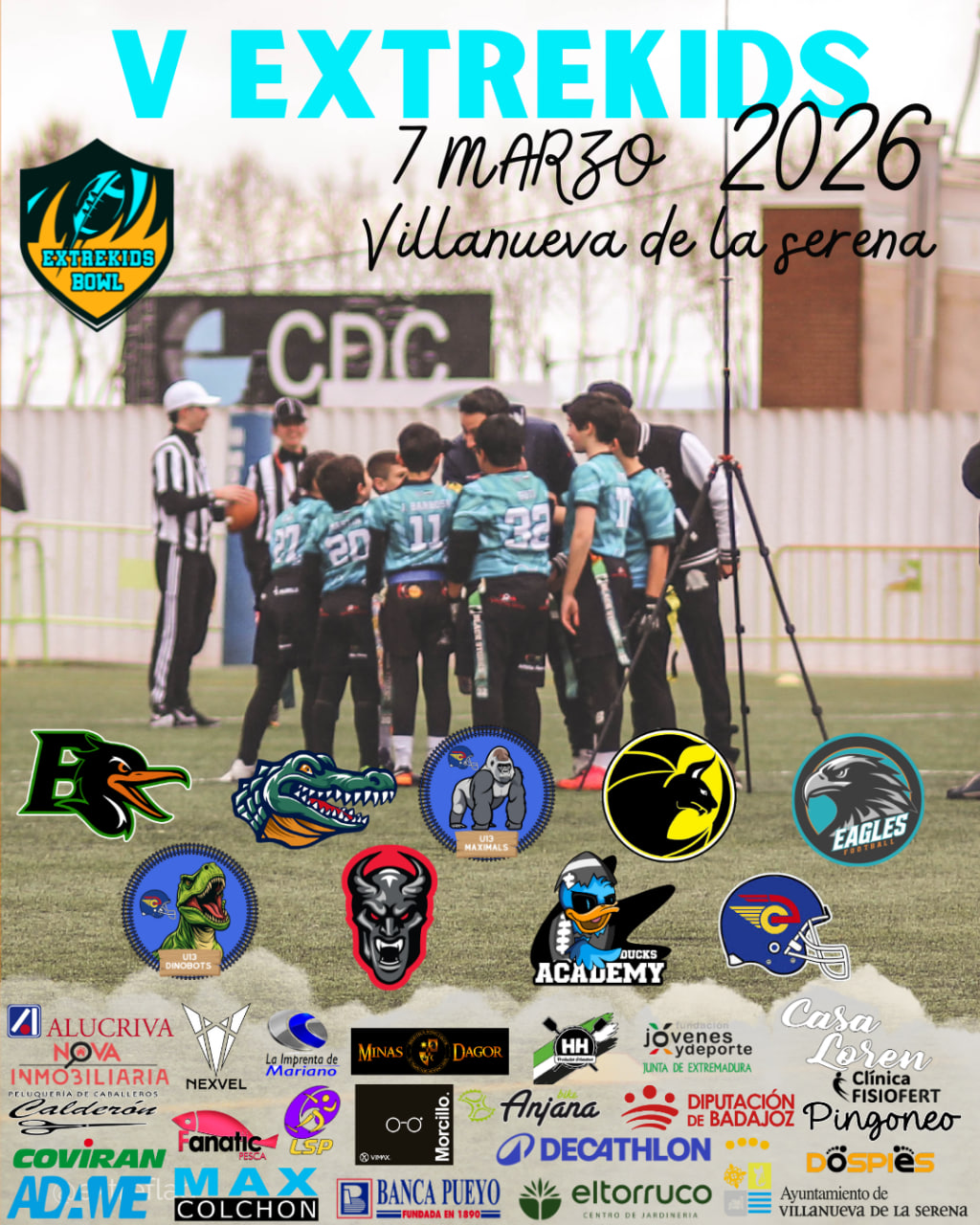 Este sábado 7 de marzo celebraremos la V Extrekids Bowl 2026 por todo lo alto. Un aniversario que llega con una edición más histórica si cabe: por primera vez habrá torneo de absolutamente todas las categorías formativas de flag football (cadete SUB17, infantil SUB15, alevín SUB13 y benjamín SUB11), y llegaremos hasta a 20 equipos participantes, nuevo récord sin duda.