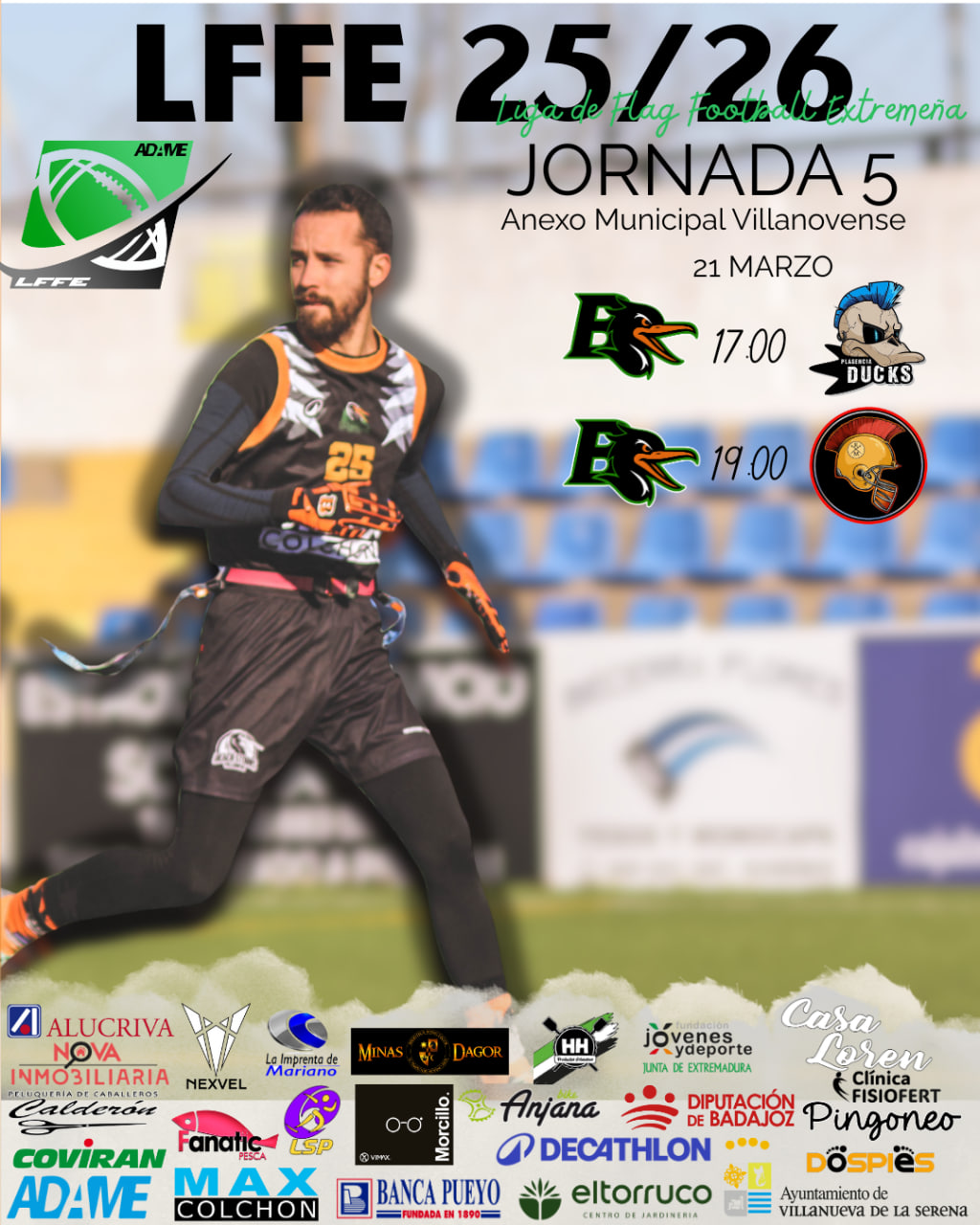 Ahora afrontamos la fase decisiva de la LFFE Open en la temporada regular, con todo por decidir en las cuatro jornadas restantes. Importantísima será la de este sábado 21 de marzo desde las 17:00h en el Anexo Municipal Villanovense. Los Black Storks se verán las caras en la vuelta ante Plasencia Ducks, líder virtual, y Mérida Romanos, rival directo en las plazas de Playoffs.
