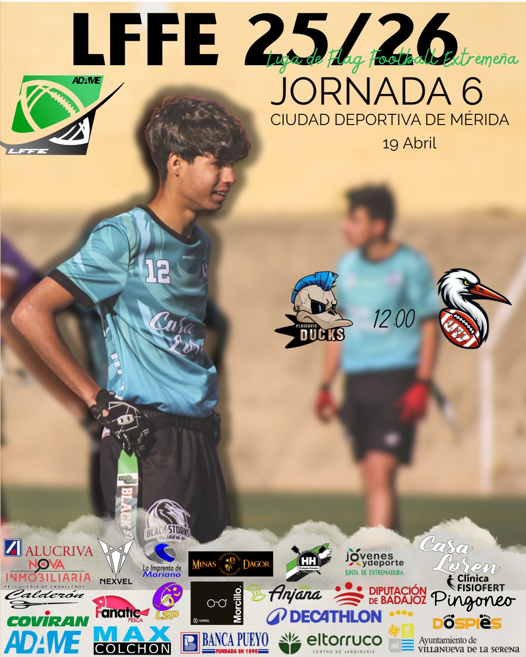 Esta es ya la jornada 6 de siete que tiene la LFFE 2026. Jugando previamente Badajoz Panthers ante Mérida Romanos y Ducks para completar su temporada regular, después nuestros juveniles se verán las caras por primera vez en la liga con los placentinos.