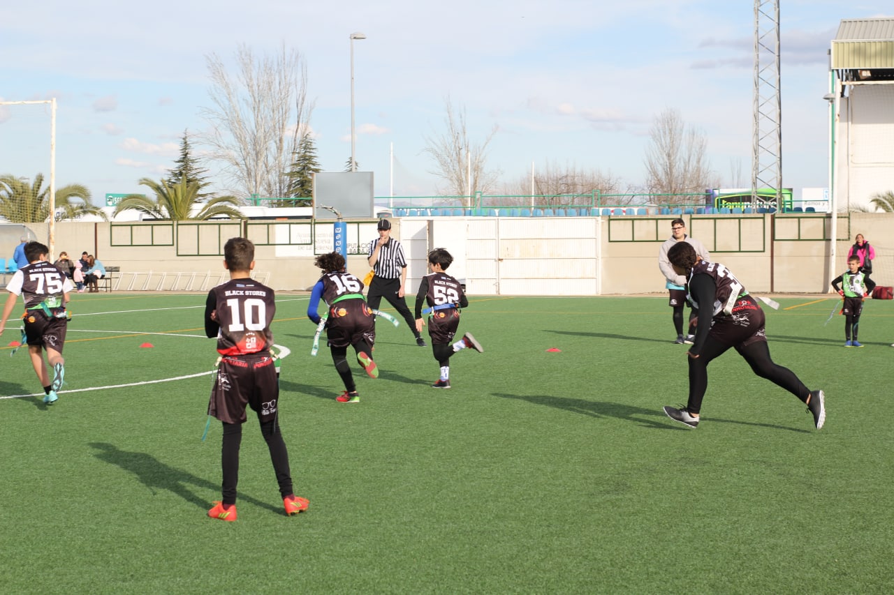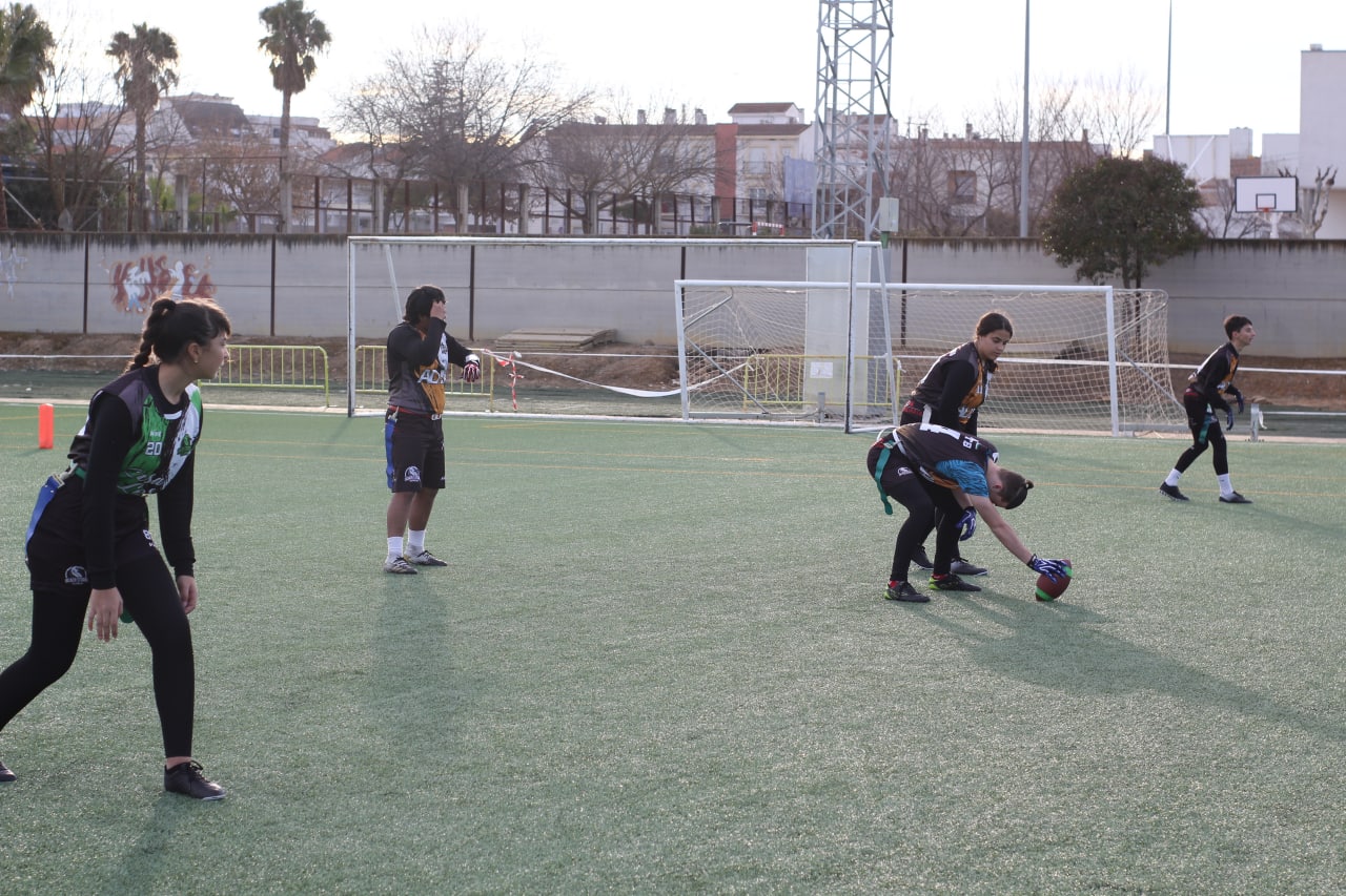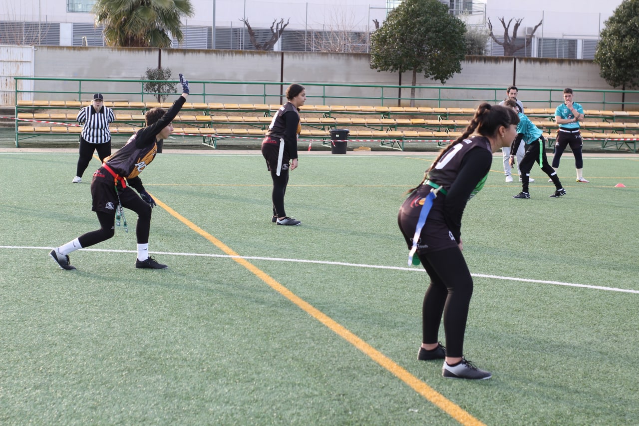Comencemos resumiendo el partido de los más pequeños. Green Storks tenía ganas de conseguir su primer triunfo en liga y en sus manos lo tuvieron. Dominaron claramente en la primera parte, abriendo el marcador tras una intercepción de María del Mar a la QB Ángela Loné. Tras ello, la quarterback de Green Laura Recio asistía a la propia María del Mar para el touchdown, y Fermín García añadía el extra point (7-0).