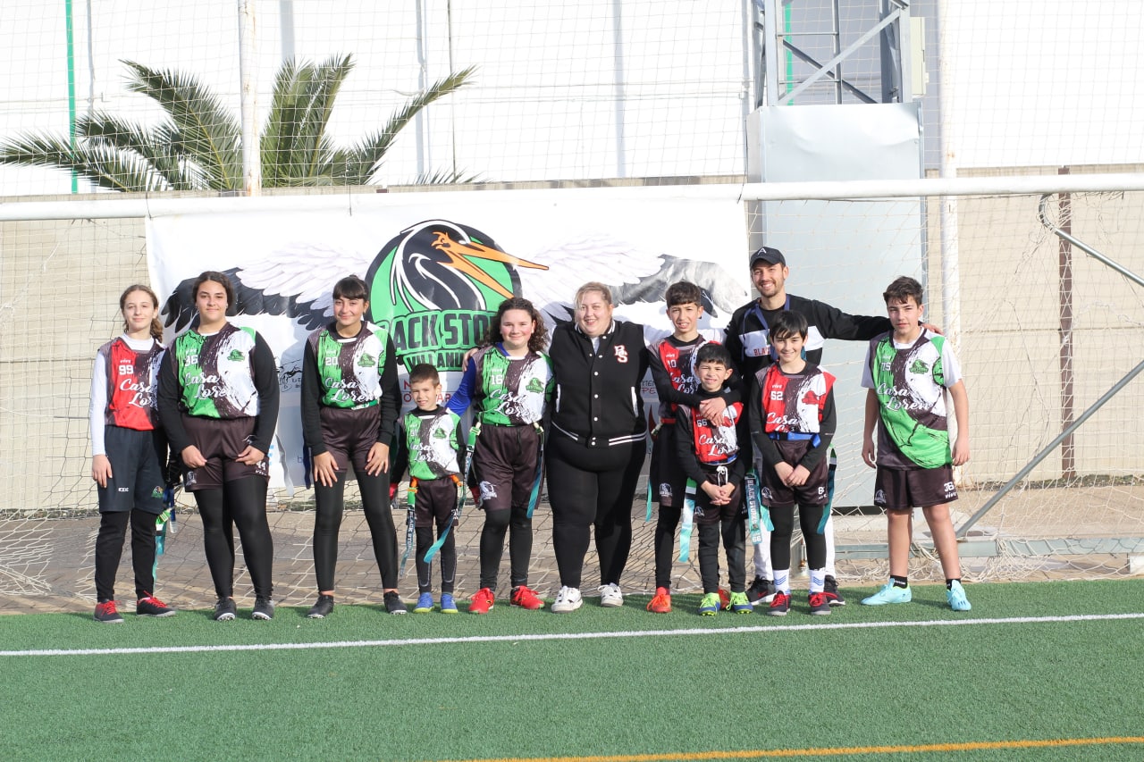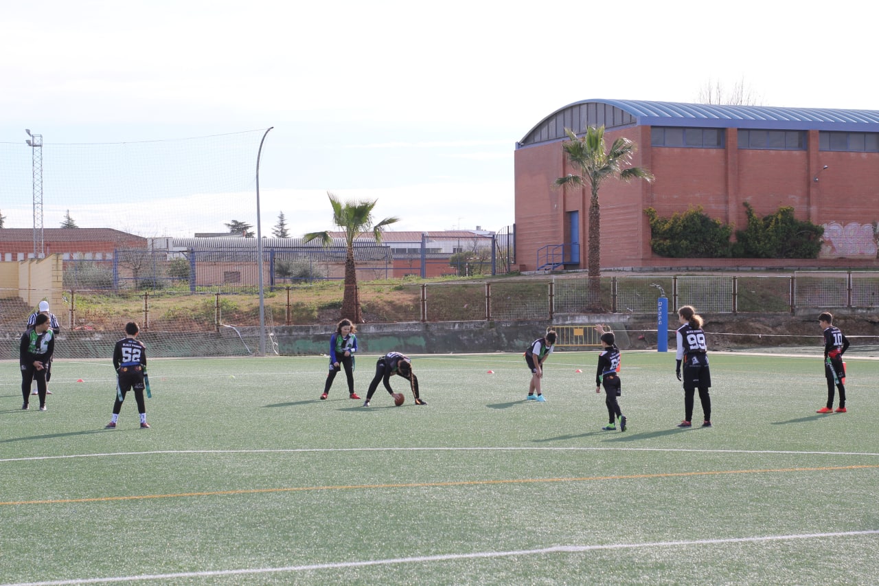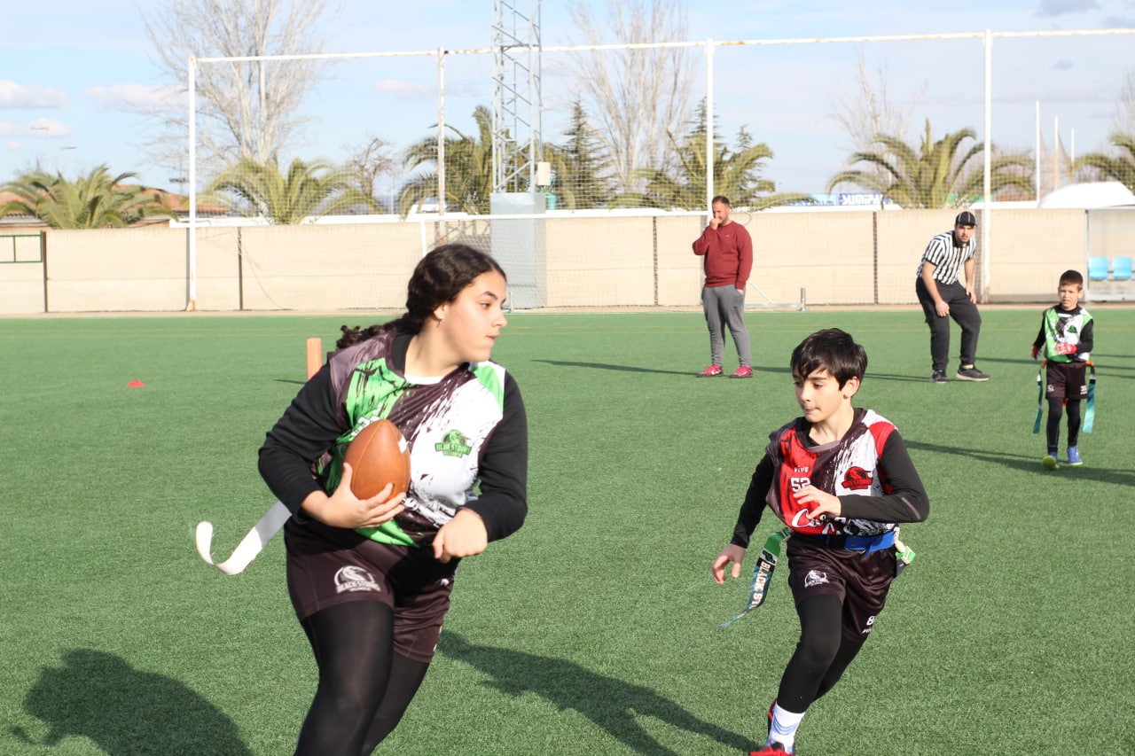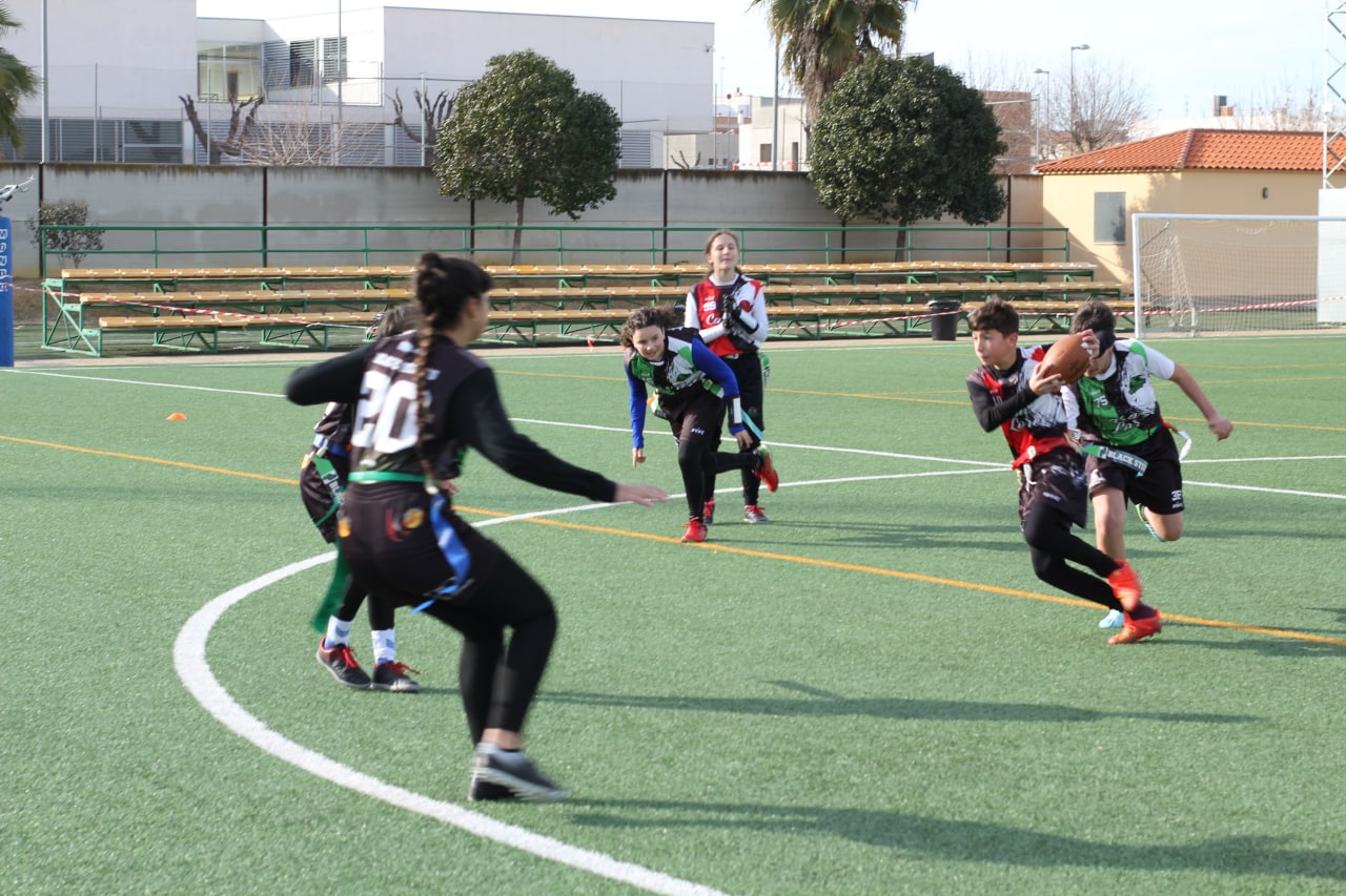 Comencemos resumiendo el partido de los más pequeños. Green Storks tenía ganas de conseguir su primer triunfo en liga y en sus manos lo tuvieron. Dominaron claramente en la primera parte, abriendo el marcador tras una intercepción de María del Mar a la QB Ángela Loné. Tras ello, la quarterback de Green Laura Recio asistía a la propia María del Mar para el touchdown, y Fermín García añadía el extra point (7-0).
